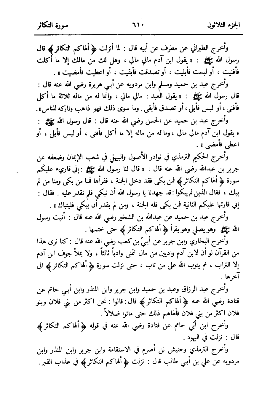 وَأخرج الطَّبَرَانِيّ عَن مطرف عَن أَبِيه قَالَ: لما أنزلت {أَلْهَاكُم التكاثر} قَالَ: رَسُول الله صلى الله عَلَيْهِ وَسلم: يَقُول ابْن آدم مَالِي مَالِي وَهل لَك من مَالك إِلَّا مَا أكلت فأفنيت أولبست فأبلست أَو تَصَدَّقت فأبقيت أَو أَعْطَيْت فأمضيت