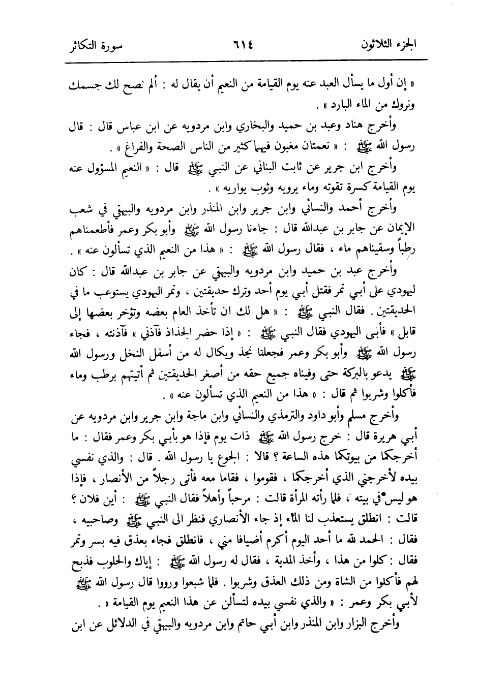 وَأخرج أَحْمد وَالنَّسَائِيّ وَابْن جرير وَابْن الْمُنْذر وَابْن مرْدَوَيْه وَالْبَيْهَقِيّ فِي شعب الإِيمان عَن جَابر بن عبد الله قَالَ: جَاءَنَا رَسُول الله صلى الله عَلَيْهِ وَسلم وَأَبُو بكر وَعمر فأطعمناهم رطبا وسقيناهم مَاء فَقَالَ رَسُول الله صلى الله عَلَيْهِ وَسلم: هَذَا النَّعيم الَّذِي تسْأَلُون عَنهُ