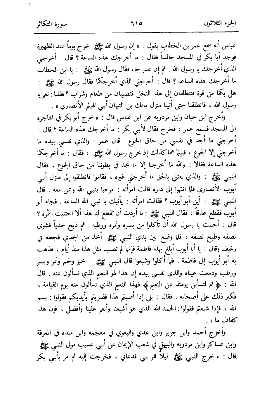 وَأخرج ابْن حبَان وَابْن مرْدَوَيْه عَن ابْن عَبَّاس قَالَ: خرج أَبُو بكر فِي الهاجرة إِلَى الْمَسْجِد فَسمع عمر فَخرج فَقَالَ لأبي بكر: مَا أخرجك هَذِه السَّاعَة قَالَ: أخرجني مَا أجد فِي نَفسِي من حاق الْجُوع