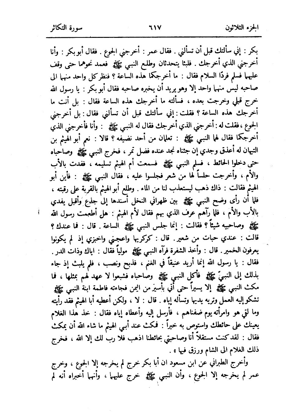 وَأخرج الطَّبَرَانِيّ عَن ابْن مَسْعُود أَن أَبَا بكر خرج لم يُخرجهُ إِلَّا الْجُوع وَخرج عمر لم يُخرجهُ إِلَّا الْجُوع وَأَن النَّبِي صلى الله عَلَيْهِ وَسلم خرج عَلَيْهِمَا وأنهما أخبراه أَنه