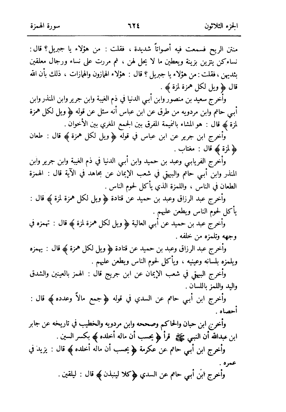 وَأخرج ابْن جرير عَن ابْن عَبَّاس قي قَوْله: {ويل لكل همزَة} قَالَ: طعان {لُمزَة} قَالَ: مغتاب