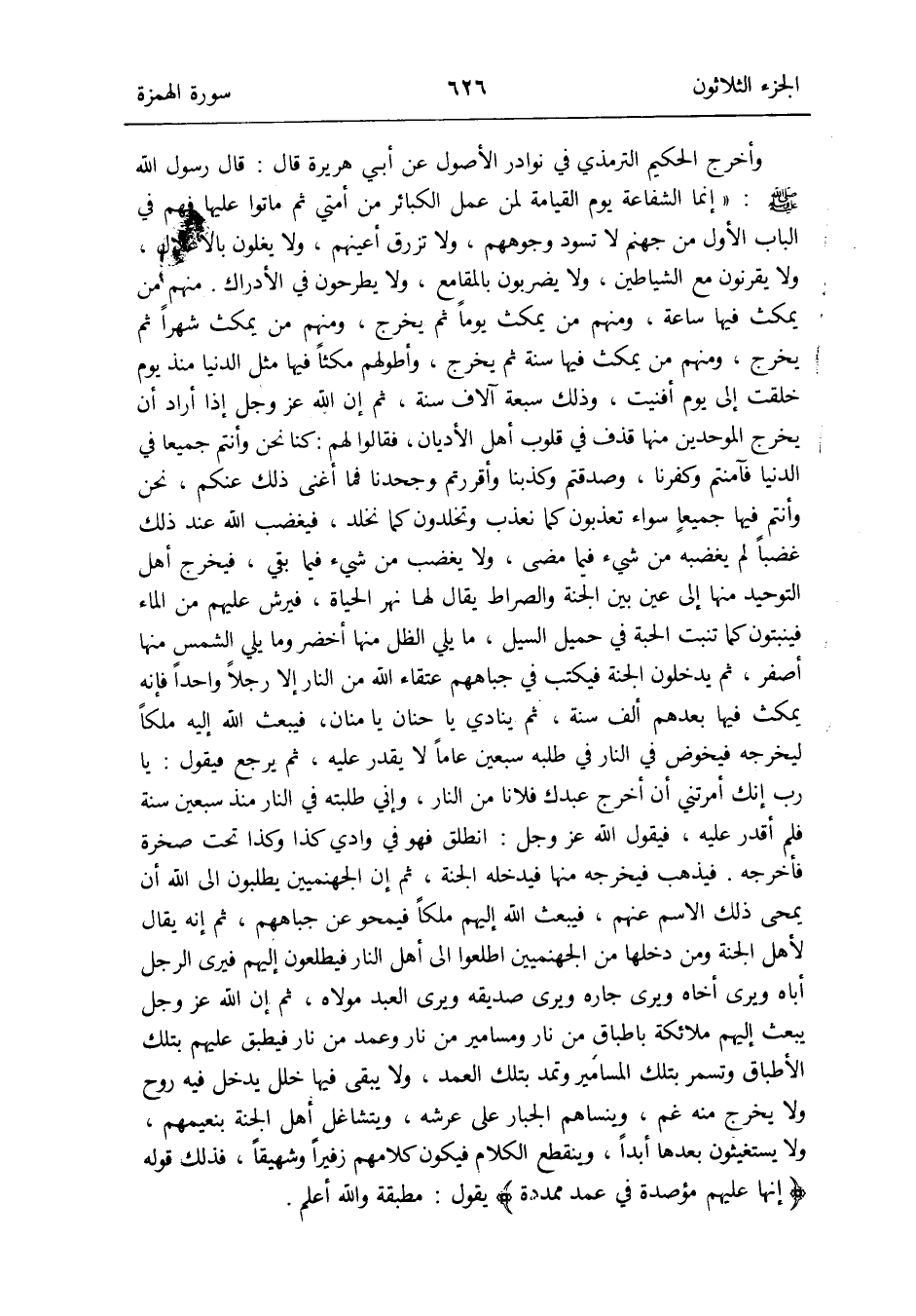 وَأخرج الْحَكِيم التِّرْمِذِيّ فِي نَوَادِر الْأُصُول عَن أبي هُرَيْرَة قَالَ: قَالَ رَسُول الله صلى الله عَلَيْهِ وَسلم: إِنَّمَا الشَّفَاعَة يَوْم الْقِيَامَة لمن عمل الْكَبَائِر من أمتِي ثمَّ مَاتُوا عَلَيْهَا فهم فِي الْبَاب الأول من جَهَنَّم لَا تسود وُجُوههم وَلَا تزرق أَعينهم وَلَا يغلون بالأغلال وَلَا يقرنون مَعَ الشَّيَاطِين وَلَا يضْربُونَ بالمقامع وَلَا يطرحون فِي الأدراك