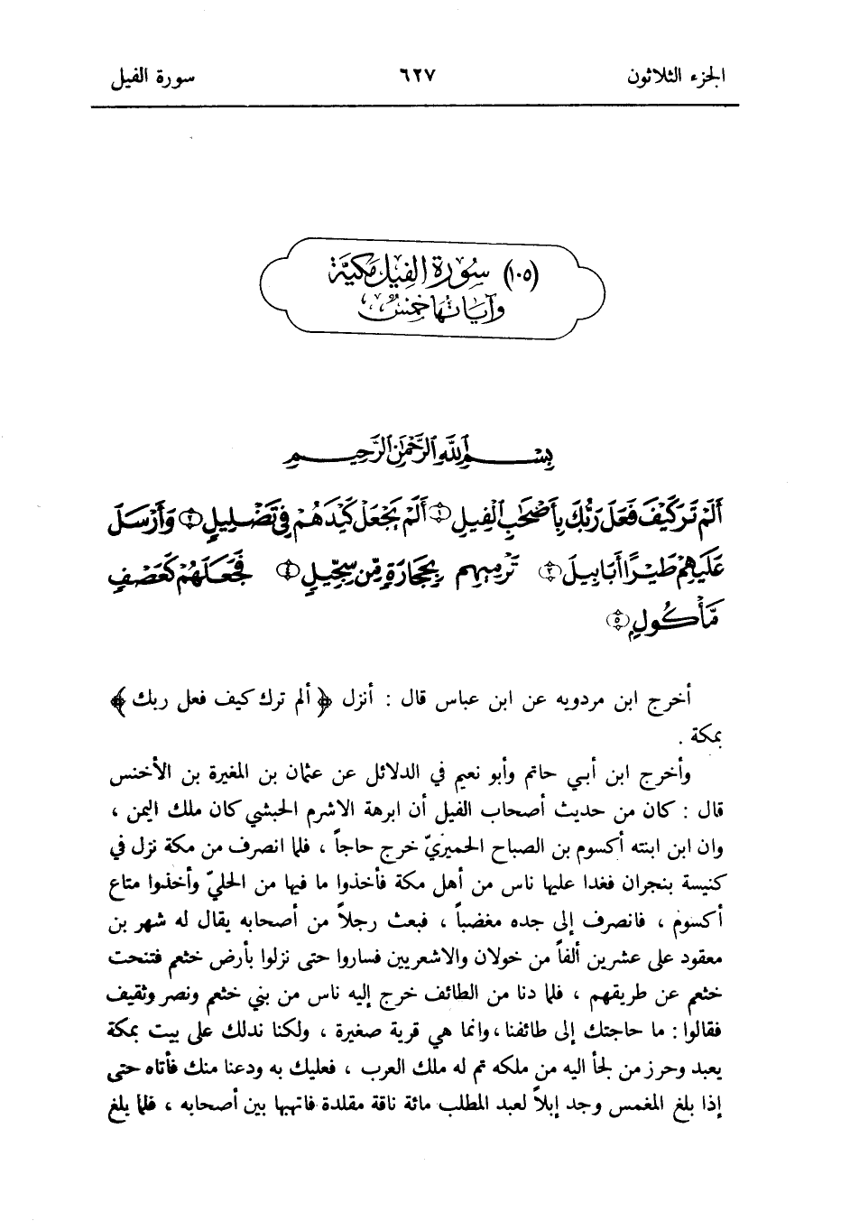 أخرج ابْن مرْدَوَيْه عَن ابْن عَبَّاس قَالَ: أنزل {ألم تَرَ كَيفَ فعل رَبك} بِمَكَّة