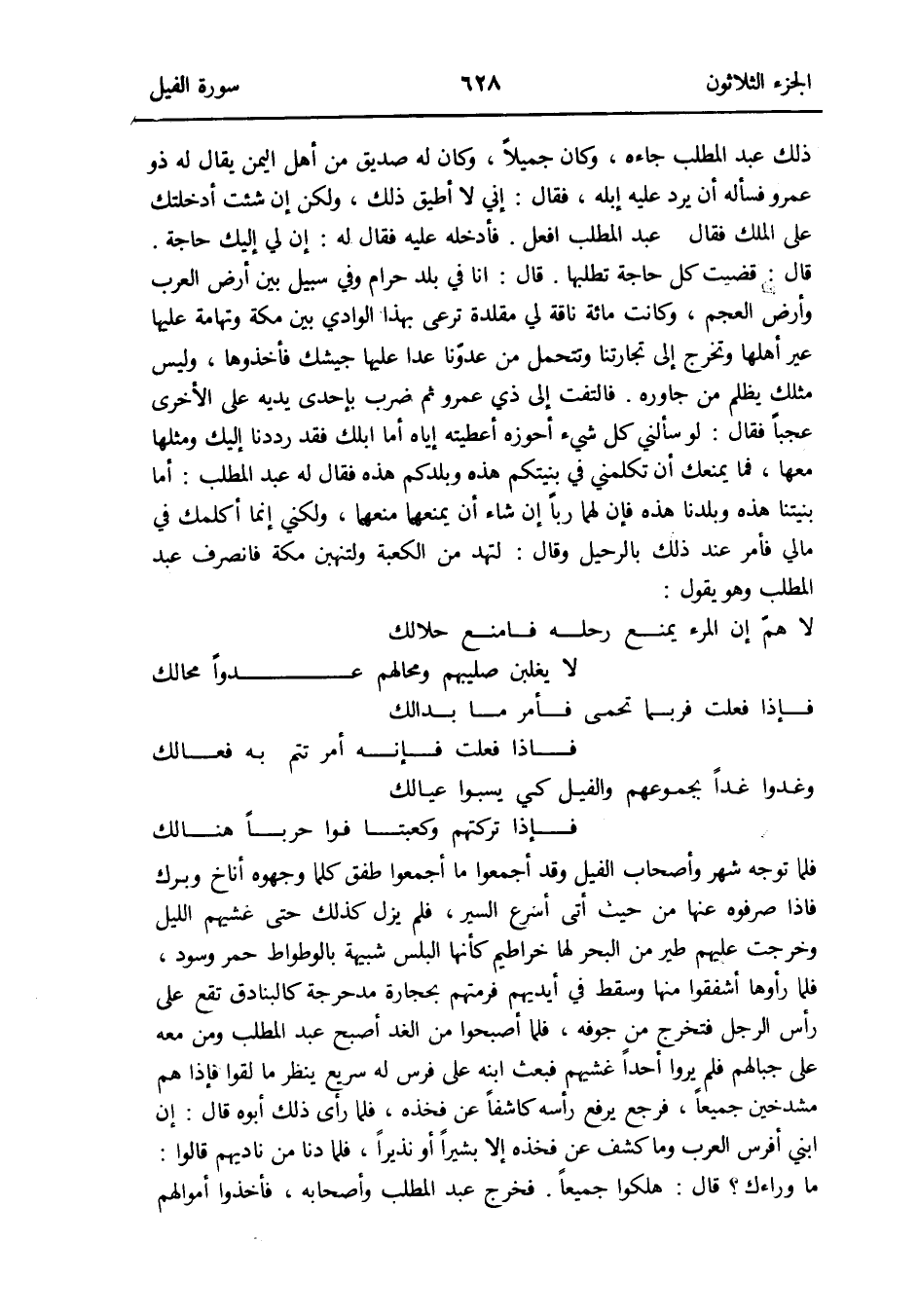 فَالْتَفت إِلَى ذِي عَمْرو ثمَّ ضرب بِإِحْدَى يَدَيْهِ على الْأُخْرَى عجبا فَقَالَ: لَو سَأَلَني كل شَيْء أحوزه أَعْطيته إِيَّاه أما ابلك فقد رددنا إِلَيْك وَمثلهَا مَعهَا فَمَا يمنعك أَن تكلمني فِي بنيتكم هَذِه وبلدكم هَذِه فَقَالَ لَهُ عبد الْمطلب: أما بنيتنا هَذِه وَبَلَدنَا هَذِه فَإِن لَهما رَبًّا إِن شَاءَ أَن يمْنَعهَا منعهما وَلَكِنِّي إِنَّمَا أُكَلِّمك فِي مَالِي فَأمر عِنْد ذَلِك بالرحيل وَقَالَ: لتهد من الْكَعْبَة ولتنهبن مَكَّة فَانْصَرف عبد الْمطلب وَهُوَ يَقُول: لَا همّ إِن الْمَرْء يمْنَع رَحْله فامنع حلالك لَا يغلبن صليبهم ومحالهم عدوا محالك فَإِذا فعلت فَرُبمَا تحمى فَأمر مَا بدالك فَإِذا فعلت فَإِنَّهُ أَمر تتمّ بِهِ فعالك وغدوا غَدا بجموعهم والفيل كي يسبوا عِيَالك فَإِذا تَركتهم وكعبتا فوا حَربًا هُنَالك فَلَمَّا توجه شهر وَأَصْحَاب الْفِيل وَقد أَجمعُوا مَا أَجمعُوا طفق كلما وجهوه أَنَاخَ وبرك فَإِذا صرفوه عَنْهَا من حَيْثُ أَتَى أسْرع السّير فَلم يزل كَذَلِك حَتَّى غشيهم اللَّيْل وَخرجت عَلَيْهِم طير من الْبَحْر لَهَا خراطيم كَأَنَّهَا البلس شَبيهَة بالوطواط حمر وسود فَلَمَّا رأوها أشفقوا مِنْهَا وَسقط فِي أَيْديهم فرمتهم بحجارة مدحرجة كالبنادق تقع على رَأس الرجل فَتخرج من جَوْفه فَلَمَّا أَصْبحُوا من الْغَد أصبح عبد الْمطلب وَمن مَعَه على جبالهم فَلم يرَوا أحدا غشيهم فَبعث ابْنه على فرس لَهُ سريع ينظر مَا لقوا فَإِذا هم مشدخين جَمِيعًا فَرجع يرفع رَأسه كاشفاً عَن فَخذه فَلَمَّا رأى ذَلِك أَبوهُ قَالَ: إِن ابْن أَفرس الْعَرَب وَمَا كشف عَن فَخذه إِلَّا بشيراً أَو نذيراً فَلَمَّا دنا من ناديهم قَالُوا مَا وَرَاءَك قَالَ: هَلَكُوا جَمِيعًا