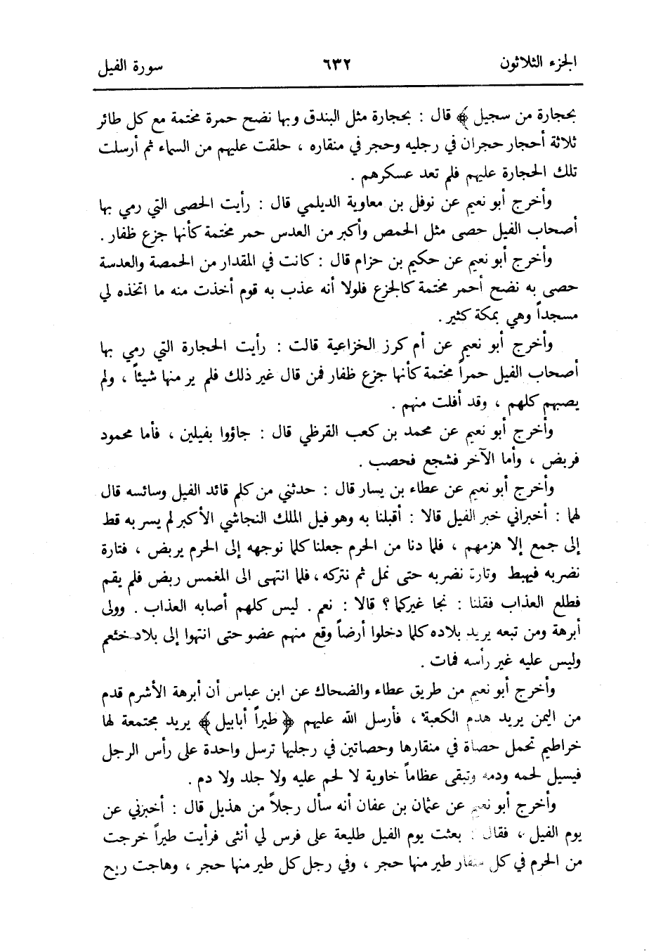 وَأخرج أَبُو نعيم من طَرِيق عَطاء وَالضَّحَّاك عَن ابْن عَبَّاس أَن أَبْرَهَة الأشرم قدم من الْيمن يُرِيد هدم الْكَعْبَة فَأرْسل الله عَلَيْهِم {طيراً أبابيل} يُرِيد مجتمعة لَهَا خراطيم تحمل حَصَاة فِي منقارها وحصاتين فِي رِجْلَيْهَا ترسل وَاحِدَة على رَأس الرجل فيسيل لَحْمه وَدَمه وَتبقى عظاماً خاوية لَا لحم عَلَيْهِ وَلَا جلد وَلَا دم