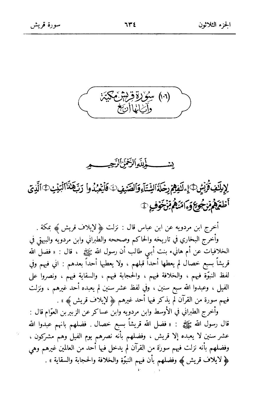 وَأخرج البُخَارِيّ فِي تَارِيخه وَالْحَاكِم وَصَححهُ وَالطَّبَرَانِيّ وَابْن مرْدَوَيْه وَالْبَيْهَقِيّ فِي الخلافيات عَن أم هَانِئ بنت أبي طَالب أَن رَسُول الله صلى الله عَلَيْهِ وَسلم قَالَ: فضل الله قُريْشًا بِسبع خِصَال لم يُعْطهَا أحدا قبلهم وَلَا يُعْطِيهَا أحدا بعدهمْ: إِنِّي فيهم وَفِي لفظ النبوّة فيهم والخلافة فيهم والحجابة فيهم والسقاية فيهم ونصروا على الْفِيل وعبدوا الله سبع سِنِين وَفِي لفظ عشر سِنِين لم يعبده أحد غَيرهم وَنزلت فيهم سُورَة من الْقُرْآن لم يذكر فِيهَا أحد غَيرهم {لإِيلاف قُرَيْش}