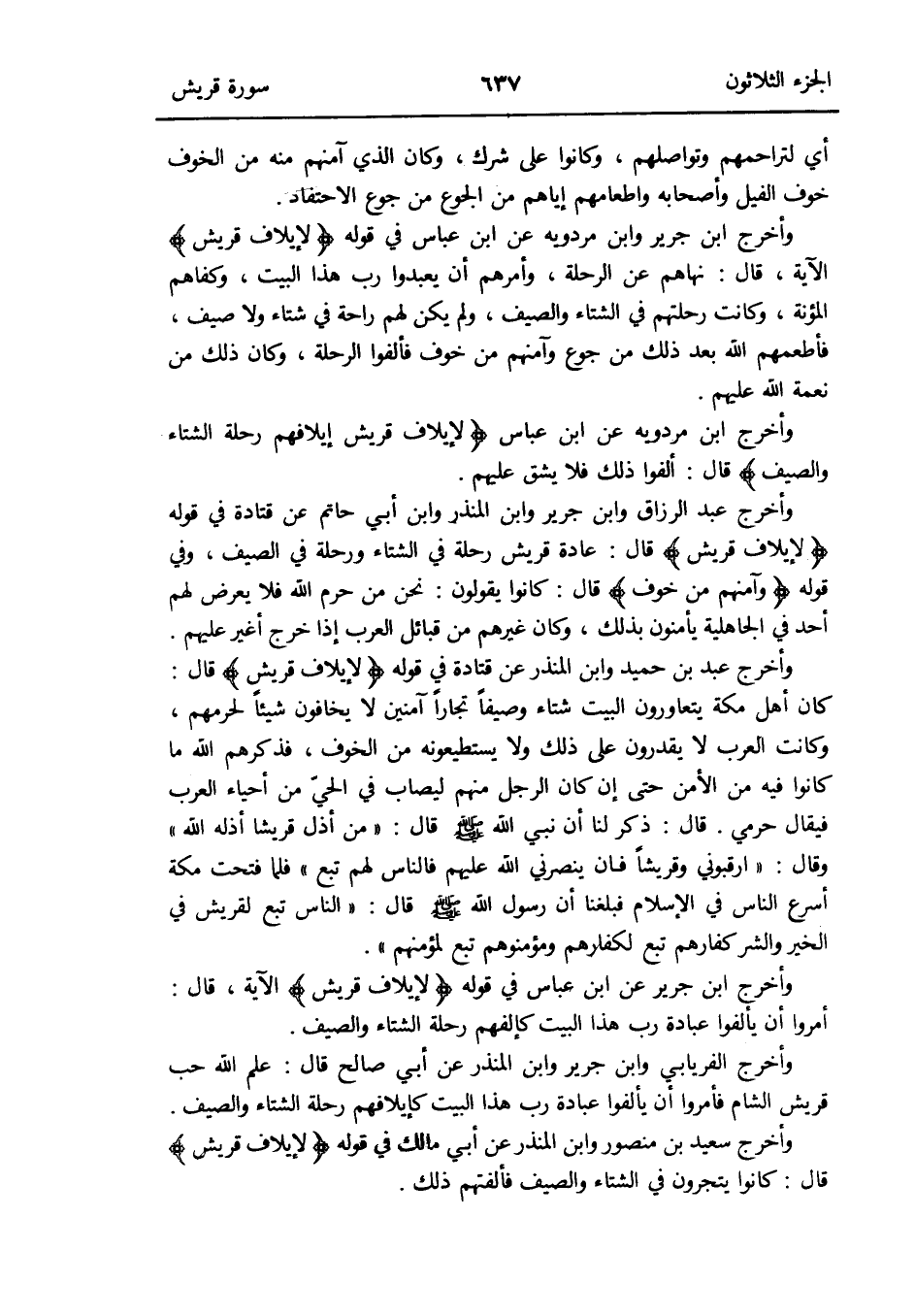 وَأخرج ابْن جرير عَن ابْن عَبَّاس فِي قَوْله: {لإِيلاف قُرَيْش} الْآيَة قَالَ: أمروا أَن يألفوا عبَادَة رب هَذَا الْبَيْت كإلفهم رحْلَة الشتَاء والصيف