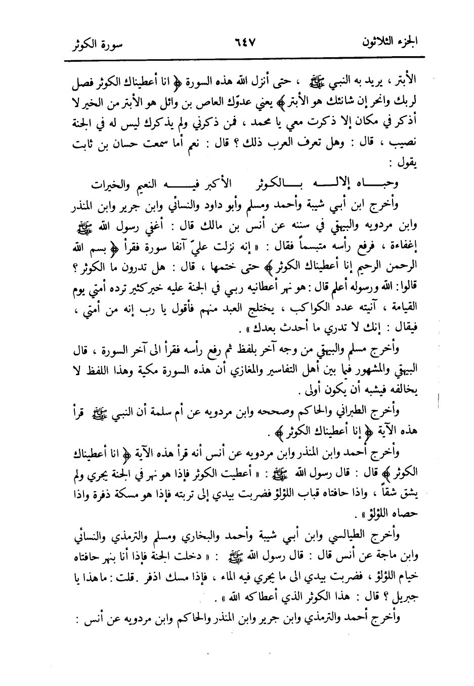 الأبتر يُرِيد بِهِ النَّبِي صلى الله عَلَيْهِ وَسلم حَتَّى أنزل الله هَذِه السُّورَة {إِنَّا أعطيناك الْكَوْثَر فصل لِرَبِّك وانحر إِن شانئك هُوَ الأبتر} يَعْنِي عدوّك الْعَاصِ بن وَائِل هُوَ الأبتر من الْخَيْر لَا أذكر فِي مَكَان إِلَّا ذكرت معي يَا مُحَمَّد فَمن ذَكرنِي وَلم يذكرك لَيْسَ لَهُ فِي الْجنَّة نصيب قَالَ: وَهل تعرف الْعَرَب ذَلِك قَالَ: نعم أما سَمِعت حسان بن ثَابت يَقُول: وحباه الإِله بالكوثر الْأَكْبَر فِيهِ النَّعيم والخيرات وَأخرج ابْن أبي شيبَة وَأحمد وَمُسلم وَأَبُو دَاوُد وَالنَّسَائِيّ وَابْن جرير وَابْن الْمُنْذر وَابْن مرْدَوَيْه وَالْبَيْهَقِيّ فِي سنَنه عَن أنس بن مَالك قَالَ: أغفي رَسُول الله صلى الله عَلَيْهِ وَسلم إغْفَاءَة فَرفع رَأسه مُتَبَسِّمًا فَقَالَ: إِنَّه نزلت عليّ آنِفا سُورَة فَقَرَأَ بِسم الله الرَّحْمَن الرَّحِيم {إِنَّا أعطيناك الْكَوْثَر} حَتَّى خَتمهَا قَالَ: هَل تَدْرُونَ مَا الْكَوْثَر قَالُوا: الله وَرَسُوله أعلم قَالَ: هُوَ نهر أعطانيه رَبِّي فِي الْجنَّة عَلَيْهِ خير كثير ترده أمتِي يَوْم الْقِيَامَة آنيته عدد الْكَوَاكِب يختلج العَبْد مِنْهُم فَأَقُول يَا رب إِنَّه من أمتِي فَيُقَال: إِنَّك لَا تَدْرِي مَا أحدث بعْدك