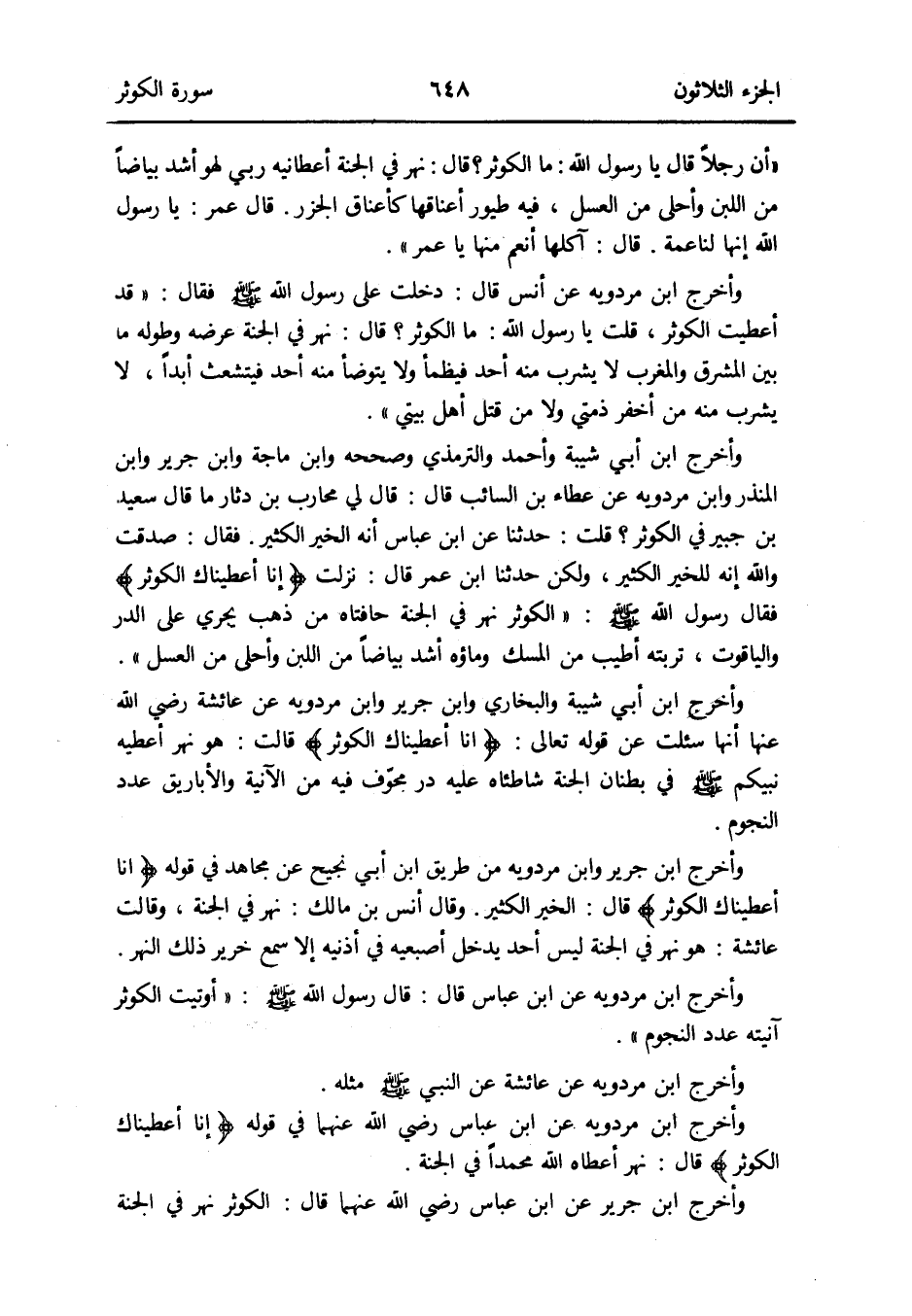 وَأخرج ابْن مرْدَوَيْه عَن ابْن عَبَّاس رَضِي الله عَنْهُمَا فِي قَوْله: {إِنَّا أعطيناك الْكَوْثَر} قَالَ: نهر أعطَاهُ الله مُحَمَّدًا فِي الْجنَّة