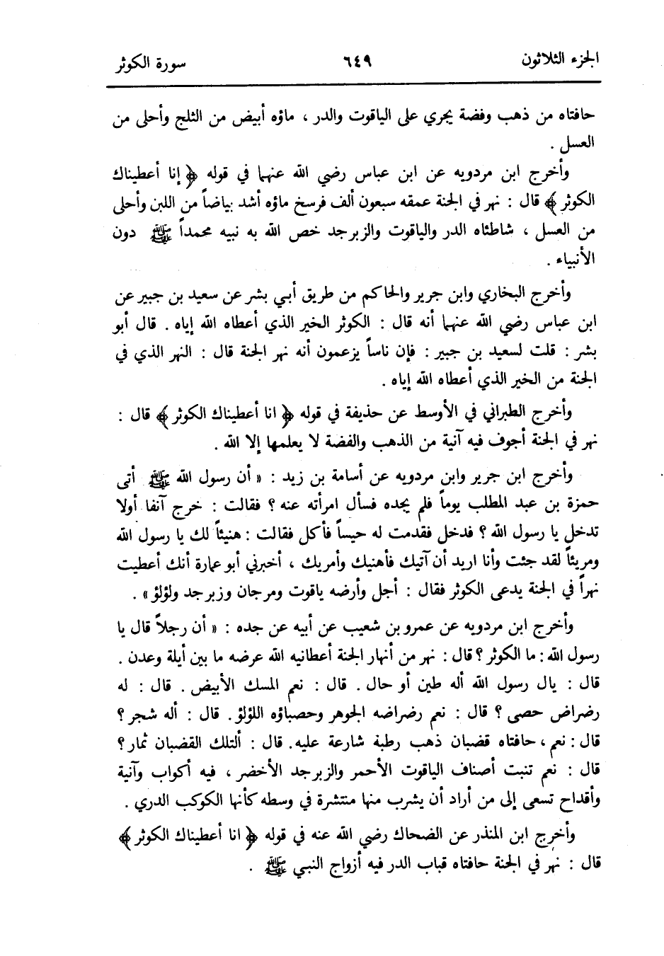 وَأخرج ابْن جرير وَابْن مرْدَوَيْه عَن أُسَامَة بن زيد: أَن رَسُول الله صلى الله عَلَيْهِ وَسلم أَتَى حَمْزَة بن عبد الْمطلب يَوْمًا فَلم يجده فَسَأَلَ امْرَأَته عَنهُ فَقَالَت: خرج آنِفا أَولا تدخل يَا رَسُول الله فَدخل فَقدمت لَهُ حَيْسًا فَأكل فَقَالَت: هَنِيئًا لَك يَا رَسُول الله ومريئاً لقد جِئْت وَأَنا أُرِيد أَن آتِيك فأهنئك وأمريك أَخْبرنِي أَبُو عمَارَة أَنَّك أَعْطَيْت نَهرا فِي الْجنَّة يدعى الْكَوْثَر فَقَالَ: أجل وأرضه ياقوت ومرجان وَزَبَرْجَد ولؤلؤ