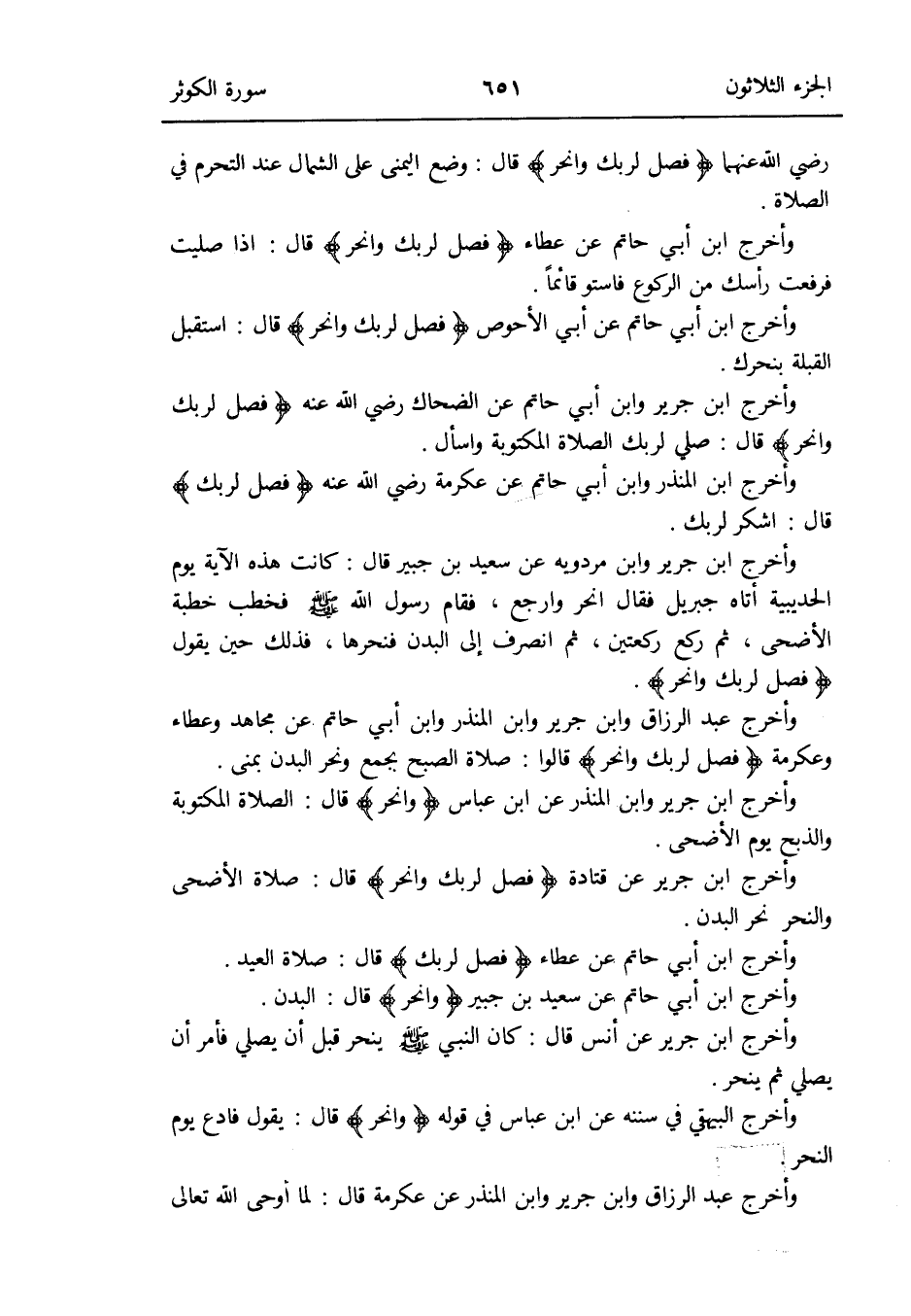 وَأخرج ابْن جرير وَابْن الْمُنْذر عَن ابْن عَبَّاس {وانحر} قَالَ: الصَّلَاة الْمَكْتُوبَة وَالذّبْح يَوْم الْأَضْحَى