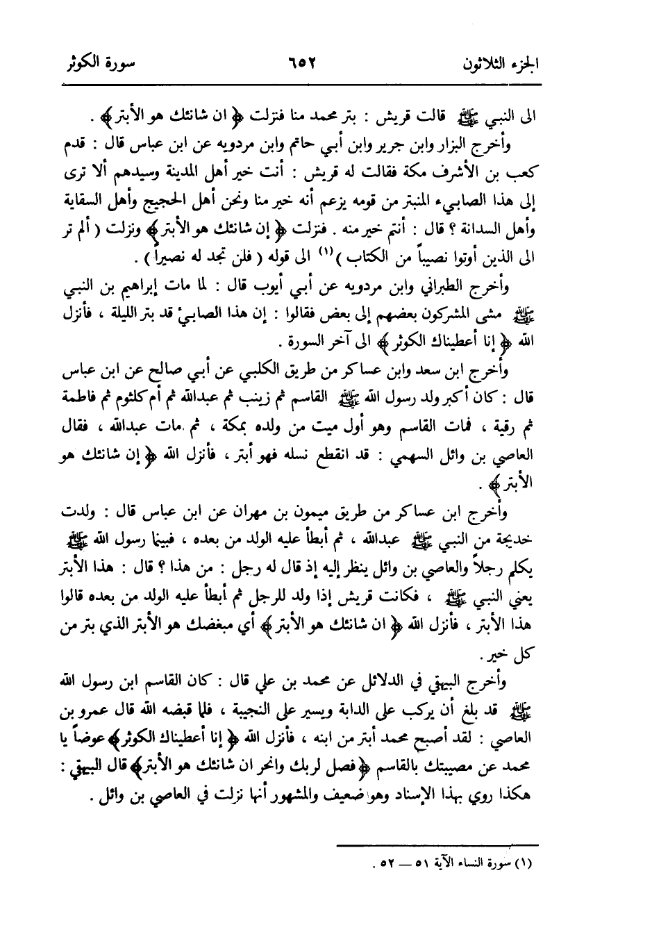 فَنزلت {إِن شانئك هُوَ الأبتر} وَنزلت (ألم تَرَ إِلَى الَّذين أُوتُوا نَصِيبا من الْكتاب) (سُورَة النِّسَاء الْآيَة 15 - 25) إِلَى قَوْله: {فَلَنْ تَجِد لَهُ نَصِيرًا} )