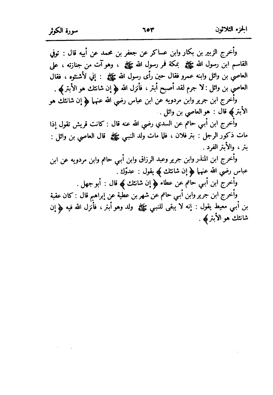 وَأخرج ابْن جرير وَابْن مرْدَوَيْه عَن ابْن عَبَّاس رَضِي الله عَنْهُمَا {إِن شانئك هُوَ الأبتر} قَالَ: هُوَ العَاصِي بن وَائِل