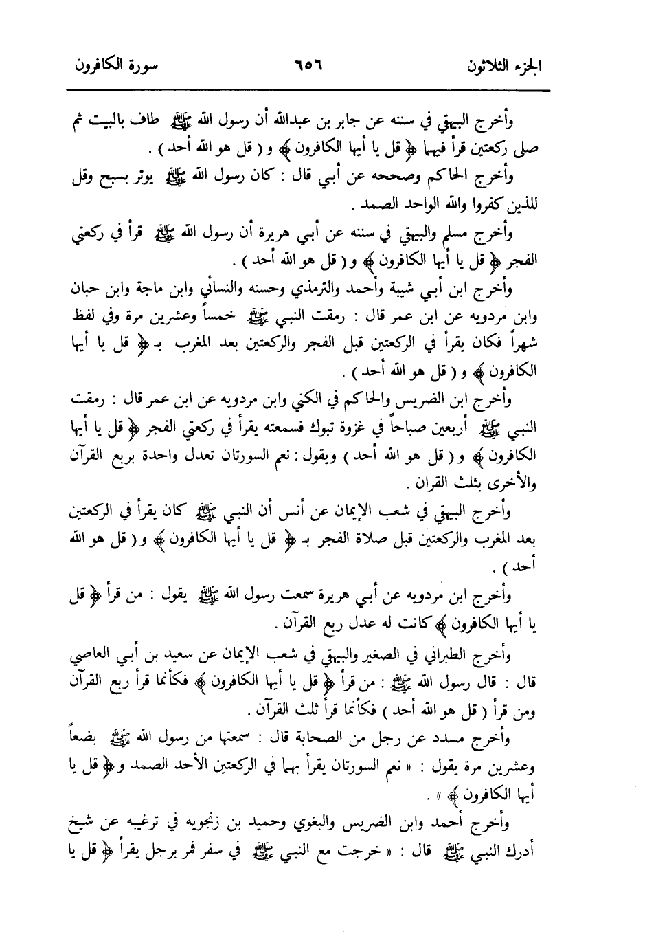 وَأخرج ابْن الضريس وَالْحَاكِم فِي الكنى وَابْن مرْدَوَيْه عَن ابْن عمر قَالَ: رمقت النَّبِي صلى الله عَلَيْهِ وَسلم أَرْبَعِينَ صباحاً فِي غَزْوَة تَبُوك فَسَمعته يقْرَأ فِي رَكْعَتي الْفجْر {قل يَا أَيهَا الْكَافِرُونَ} و (قل هُوَ الله أحد) وَيَقُول: نعم السورتان تعدل وَاحِدَة بِربع الْقُرْآن وَالْأُخْرَى بِثلث الْقُرْآن
