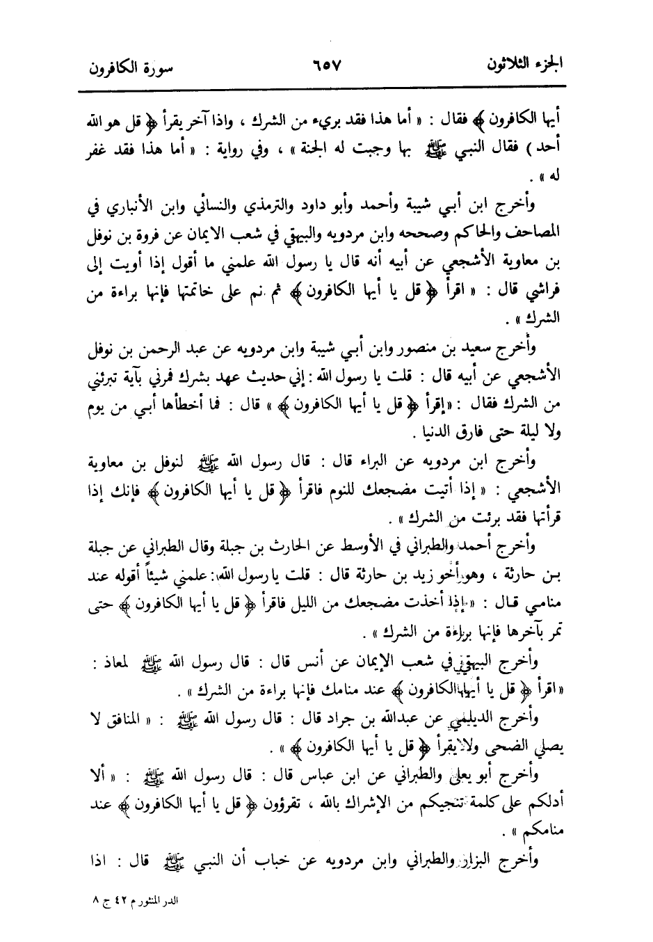 وَأخرج ابْن أبي شيبَة وَأحمد وَأَبُو دَاوُد وَالتِّرْمِذِيّ وَالنَّسَائِيّ وَابْن الْأَنْبَارِي فِي الْمَصَاحِف وَالْحَاكِم وَصَححهُ وَابْن مرْدَوَيْه وَالْبَيْهَقِيّ فِي شعب الإِيمان عَن فَرْوَة بن نَوْفَل بن مُعَاوِيَة الْأَشْجَعِيّ عَن أَبِيه أَنه قَالَ يَا رَسُول الله عَلمنِي مَا أَقُول إِذا أويت إِلَى فِرَاشِي قَالَ: اقْرَأ {قل يَا أَيهَا الْكَافِرُونَ} ثمَّ نم على خاتمتها فَإِنَّهَا بَرَاءَة من الشّرك