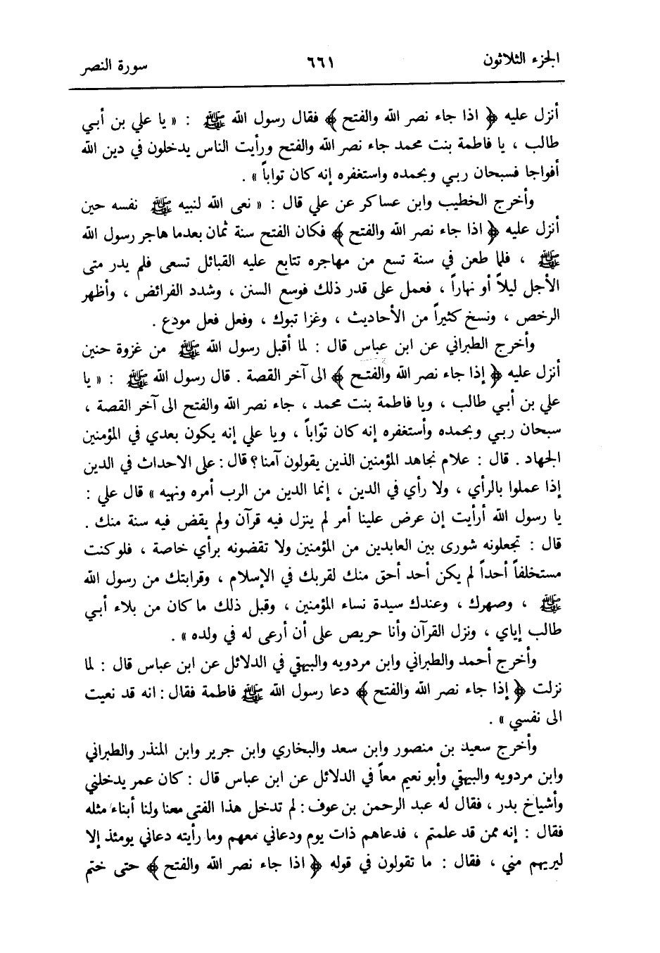 قَالَ رَسُول الله صلى الله عَلَيْهِ وَسلم: يَا عَليّ بن أبي طَالب وَيَا فَاطِمَة بنت مُحَمَّد جَاءَ نصر الله وَالْفَتْح إِلَى آخر الْقِصَّة سُبْحَانَ رَبِّي وَبِحَمْدِهِ وأستغفره إِنَّه كَانَ توّاباً وَيَا عَليّ إِنَّه يكون بعدِي فِي الْمُؤمنِينَ الْجِهَاد