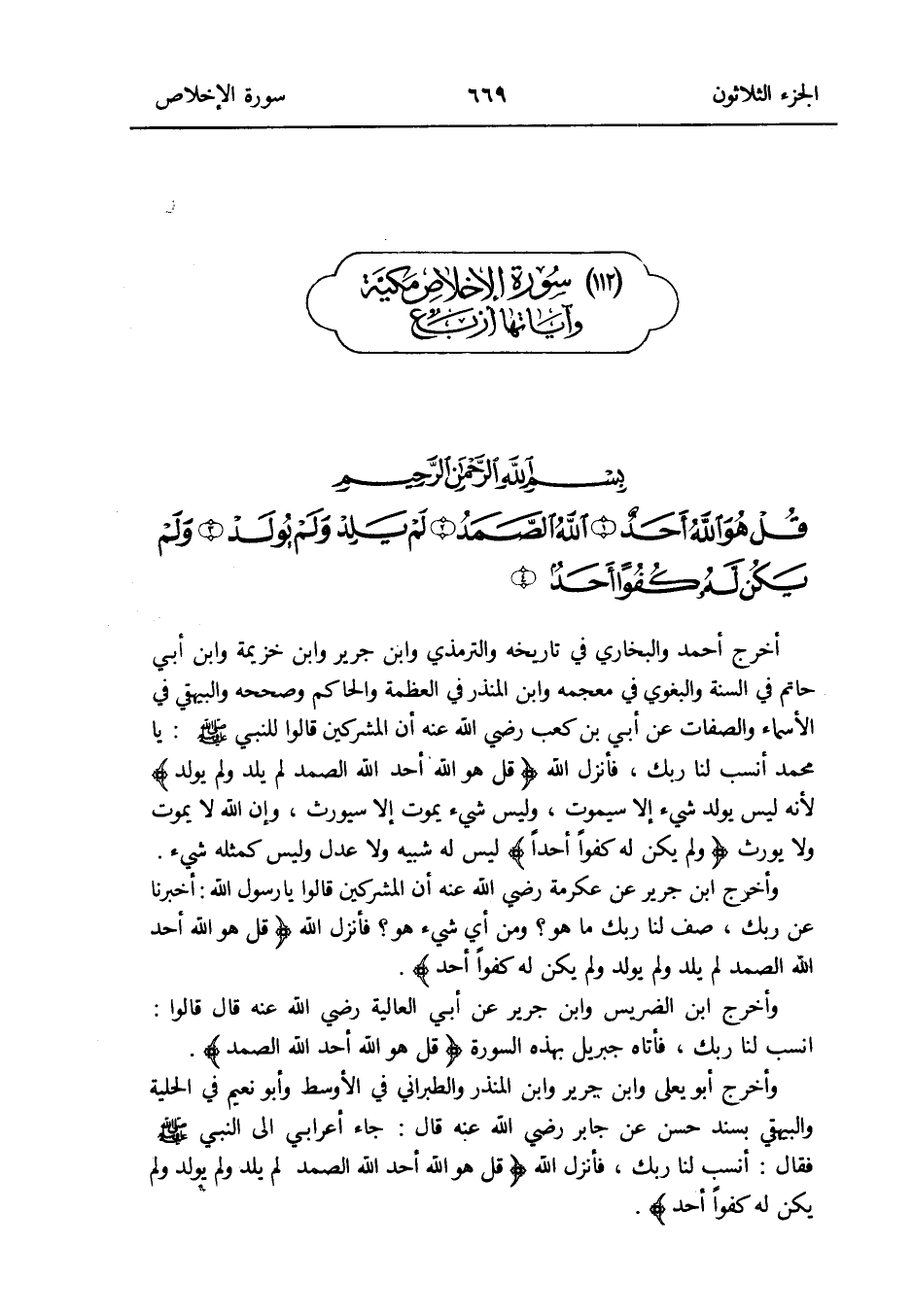 أخرج أَحْمد وَالْبُخَارِيّ فِي تَارِيخه وَالتِّرْمِذِيّ وَابْن جرير وَابْن خُزَيْمَة وَابْن أبي حَاتِم فِي السّنة وَالْبَغوِيّ فِي مُعْجَمه وَابْن الْمُنْذر فِي العظمة وَالْحَاكِم وَصَححهُ وَالْبَيْهَقِيّ فِي الْأَسْمَاء وَالصِّفَات عَن أبي بن كَعْب رَضِي الله عَنهُ أَن الْمُشْركين قَالُوا للنَّبِي صلى الله عَلَيْهِ وَسلم: يَا مُحَمَّد أنسب لنا رَبك فَأنْزل الله {قل هُوَ الله أحد الله الصَّمد لم يلد وَلم يُولد} لِأَنَّهُ لَيْسَ يُولد شَيْء إِلَّا سيموت وَلَيْسَ شَيْء يَمُوت إِلَّا سيورث وَإِن الله لَا يَمُوت وَلَا يُورث {وَلم يكن لَهُ كفوا أحد} لَيْسَ لَهُ شيبَة وَلَا عدل وَلَيْسَ كمثله شَيْء