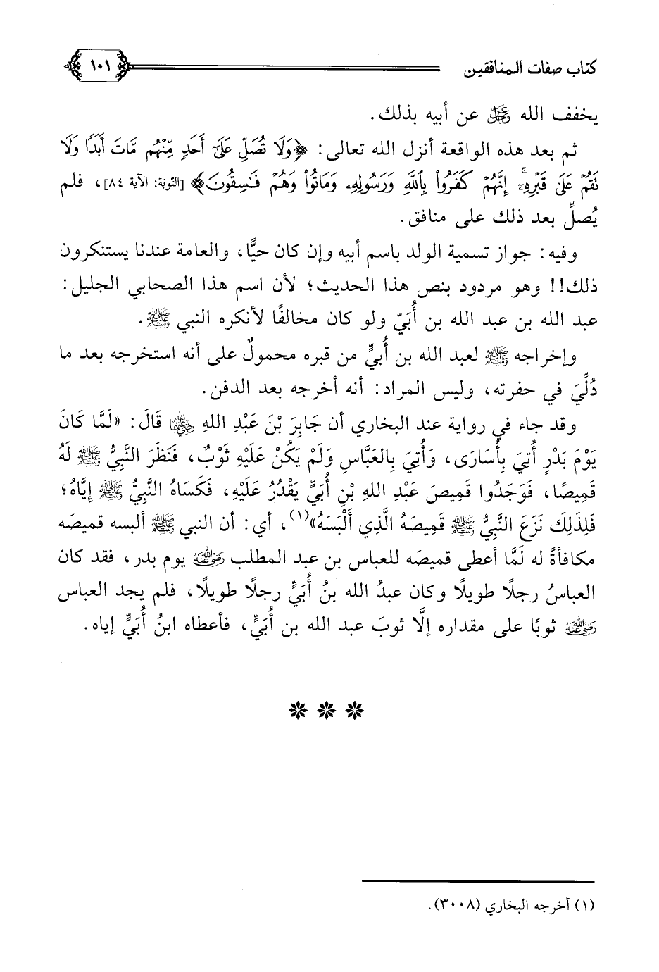 وقد جاء في رواية عند البخاري أن ((جَابِرَ بْنَ عَبْدِ اللَّهِ رَضِيَ اللَّهُ عَنْهُمَا قَالَ: لَمَّا كَانَ يَوْمَ بَدْرٍ أُتِيَ بِأُسَارَى، وَأُتِيَ بِالعَبَّاسِ وَلَمْ يَكُنْ عَلَيْهِ ثَوْبٌ، فَنَظَرَ النَّبِيُّ صَلَّى اللهُ عَلَيْهِ وَسَلَّمَ لَهُ قَمِيصًا، فَوَجَدُوا قَمِيصَ عَبْدِ اللَّهِ بْنِ أُبَيٍّ يَقْدُرُ عَلَيْهِ، فَكَسَاهُ النَّبِيُّ صَلَّى اللهُ عَلَيْهِ وَسَلَّمَ إِيَّاهُ؛ فَلِذَلِكَ نَزَعَ النَّبِيُّ صَلَّى اللهُ عَلَيْهِ وَسَلَّمَ قَمِيصَهُ الَّذِي أَلْبَسَهُ)) (¬١)، أي: أن النبي صلى الله عليه وسلم ألبسه قميصَه مكافأةً له لَمَّا أعطى قميصَه للعباس بن عبد المطلب رضي الله عنه يوم بدر، فقد كان العباسُ رجلًا طويلًا وكان عبدُ الله بنُ أُبَيٍّ رجلًا طويلًا، فلم يجد العباس رضي الله عنه ثوبًا على مقداره إلَّا ثوبَ عبد الله بن أُبَيٍّ، فأعطاه ابنُ أُبَيٍّ إياه.