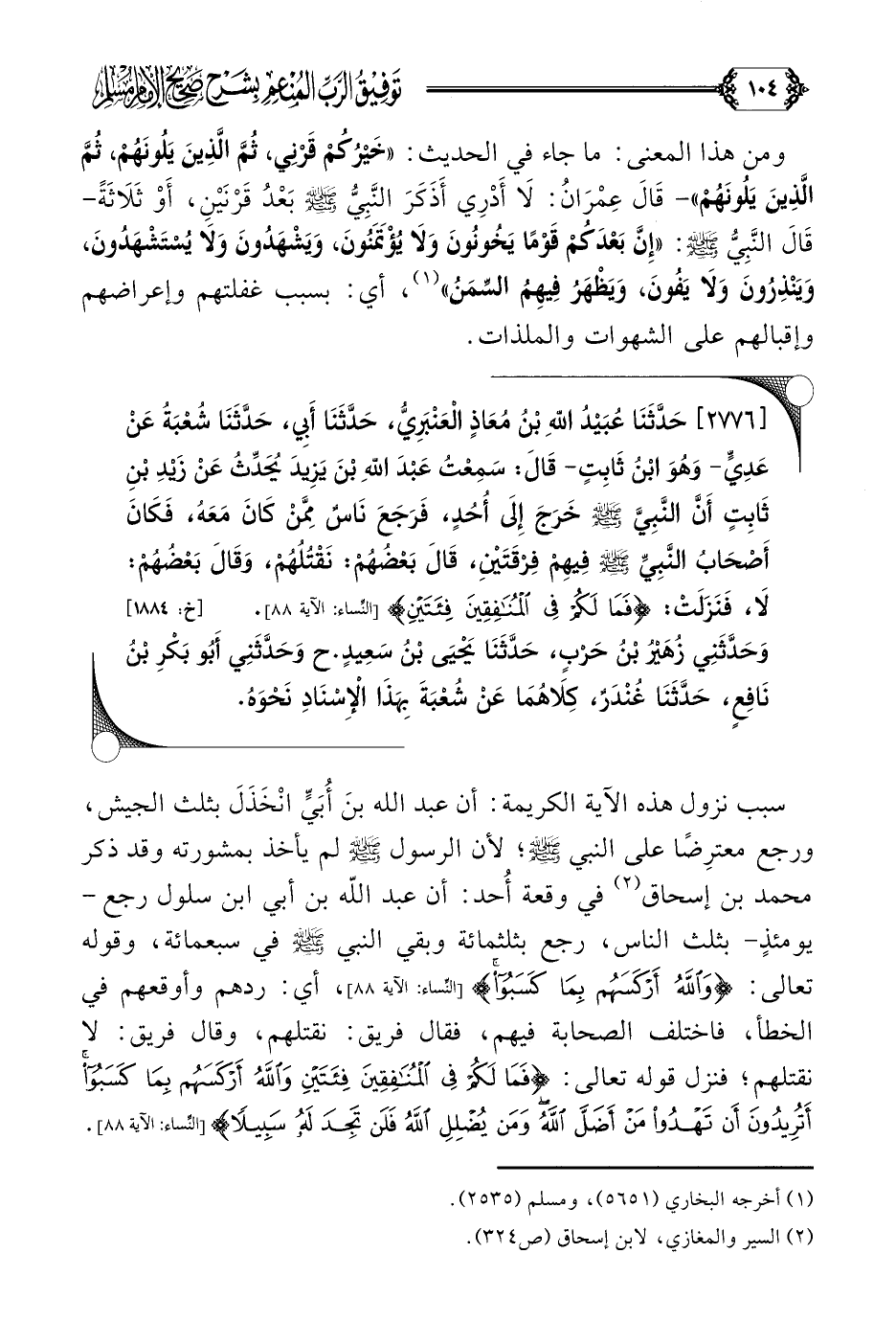[٢٧٧٦] حَدَّثَنَا عُبَيْدُ اللَّهِ بْنُ مُعَاذٍ الْعَنْبَرِيُّ، حَدَّثَنَا أَبِي، حَدَّثَنَا شُعْبَةُ عَنْ عَدِيٍّ- وَهُوَ ابْنُ ثَابِتٍ- قَالَ: سَمِعْتُ عَبْدَ اللَّهِ بْنَ يَزِيدَ يُحَدِّثُ عَنْ زَيْدِ بْنِ ثَابِتٍ أَنَّ النَّبِيَّ صلى الله عليه وسلم خَرَجَ إِلَى أُحُدٍ، فَرَجَعَ نَاسٌ مِمَّنْ كَانَ مَعَهُ، فَكَانَ أَصْحَابُ النَّبِيِّ صلى الله عليه وسلم فِيهِمْ فِرْقَتَيْنِ، قَالَ بَعْضُهُمْ: نَقْتُلُهُمْ، وَقَالَ بَعْضُهُمْ: لَا، فَنَزَلَتْ: {فَمَا لَكُمْ فِي الْمُنَافِقِينَ فِئَتَيْنِ}.