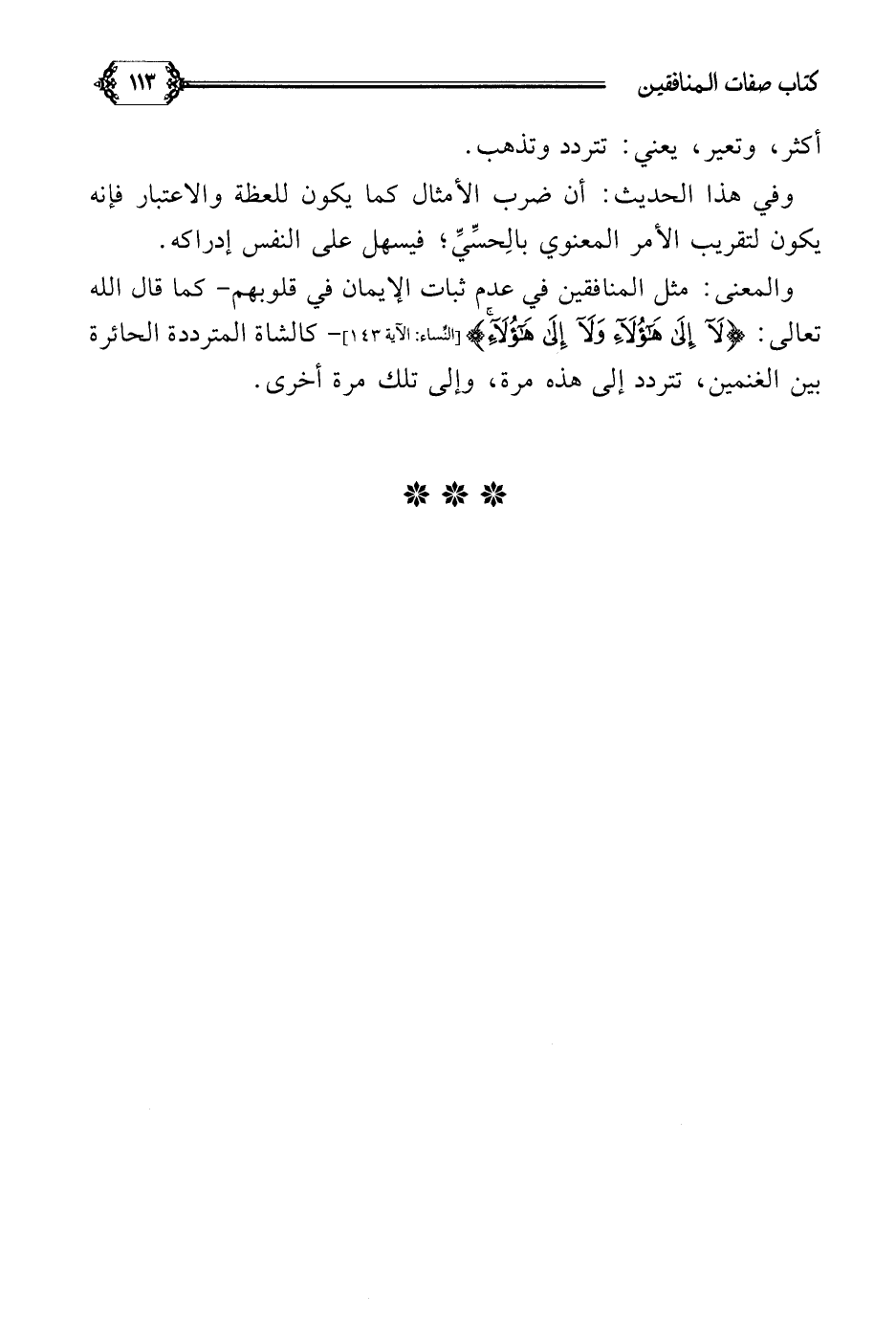 والمعنى: مثل المنافقين في عدم ثبات الإيمان في قلوبهم- كما قال الله تعالى: {لا إلى هؤلاء ولا إلى هؤلاء} - كالشاة المترددة الحائرة بين الغنمين، تتردد إلى هذه مرة، وإلى تلك مرة أخرى.