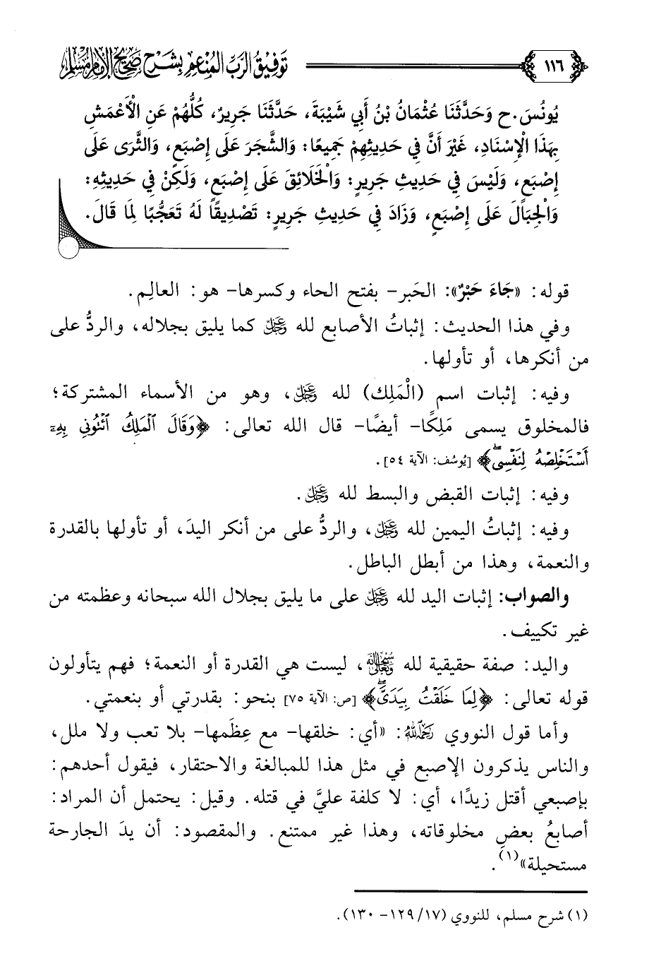 وأما قول النووي رحمه الله: ((أي: خلقها- مع عِظَمها- بلا تعب ولا ملل، والناس يذكرون الإصبع في مثل هذا للمبالغة والاحتقار، فيقول أحدهم: بإصبعي أقتل زيدًا، أي: لا كلفة عليَّ في قتله. وقيل: يحتمل أن المراد: أصابعُ بعضِ مخلوقاته، وهذا غير ممتنع. والمقصود: أن يدَ الجارحة مستحيلة)). (¬١)