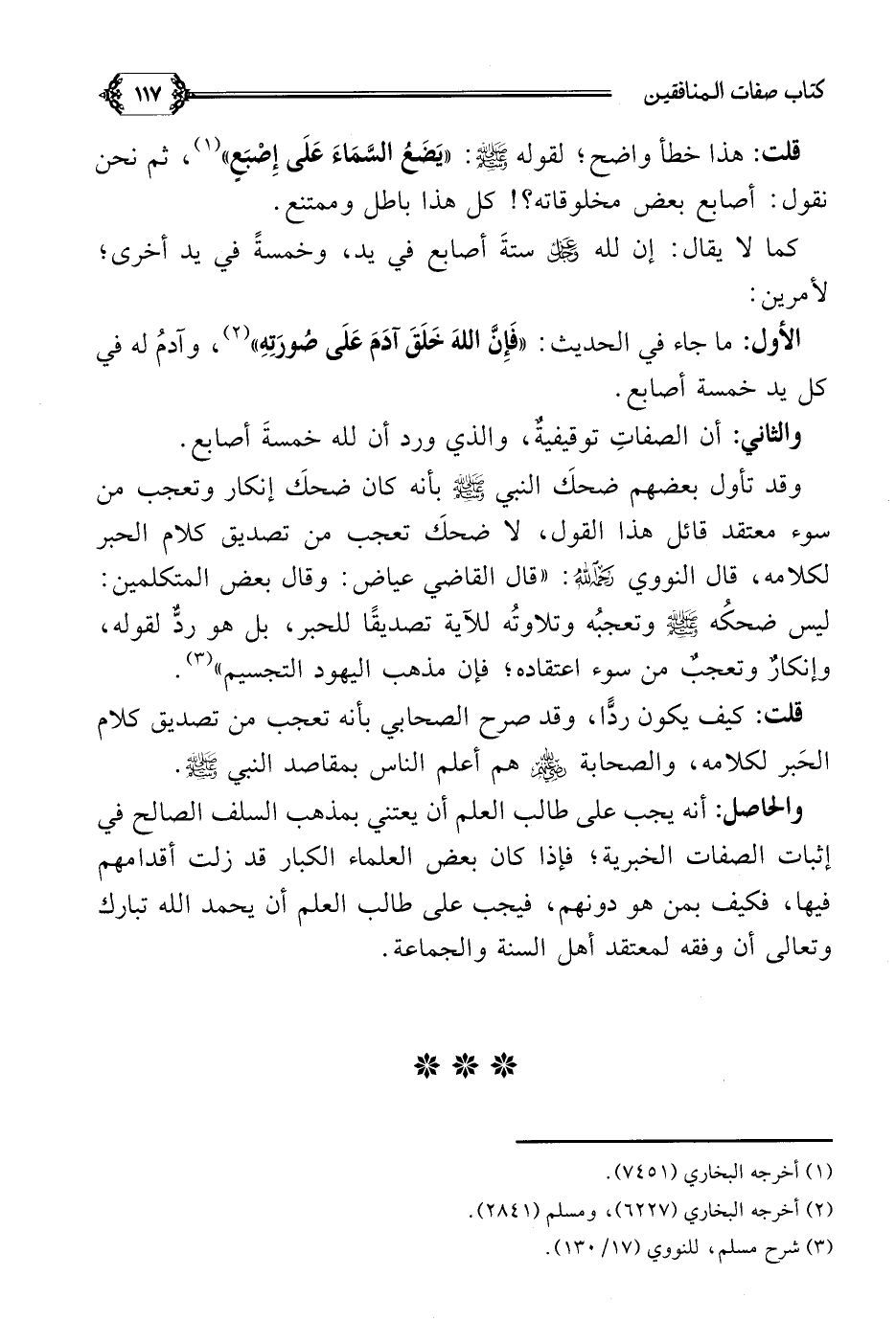 قلت: هذا خطأ واضح؛ لقوله صلى الله عليه وسلم: ((يَضَعُ السَّمَاءَ عَلَى إِصْبَعٍ)) (¬١)، ثم نحن نقول: أصابع بعض مخلوقاته؟ ! كل هذا باطل وممتنع.