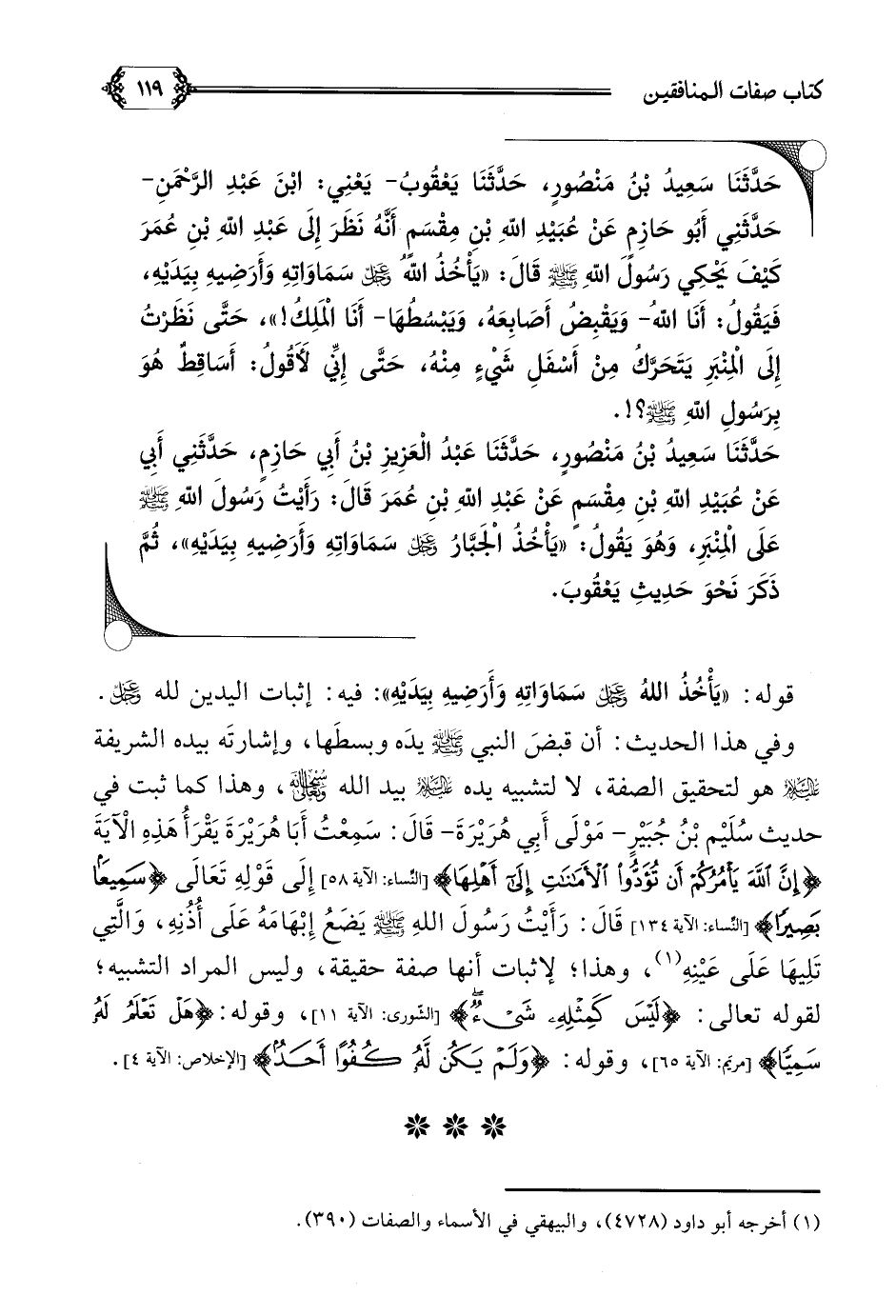 وفي هذا الحديث: أن قبضَ النبي صلى الله عليه وسلم يدَه وبسطَها، وإشارتَه بيده الشريفة عليه السلام هو لتحقيق الصفة، لا لتشبيه يده عليه السلام بيد الله سبحانه وتعالى، وهذا كما ثبت في حديث ((سُلَيْم بْنُ جُبَيْرٍ- مَوْلَى أَبِي هُرَيْرَةَ- قَالَ: سَمِعْتُ أَبَا هُرَيْرَةَ يَقْرَأُ هَذِهِ الْآيَةَ {إِنَّ اللَّهَ يَأْمُرُكُمْ أَنْ تُؤَدُّوا الْأَمَانَاتِ إِلَى أَهْلِهَا} [النساء: ٥٨] إِلَى قَوْلِهِ تَعَالَى {سَمِيعًا بَصِيرًا} [النساء: ٥٨] قَالَ: رَأَيْتُ رَسُولَ اللَّهِ صَلَّى اللهُ عَلَيْهِ وَسَلَّمَ يَضَعُ إِبْهَامَهُ عَلَى أُذُنِهِ، وَالَّتِي تَلِيهَا عَلَى عَيْنِهِ)) (¬١) وهذا؛ لإثبات أنها صفة حقيقةً، وليس المراد التشبيه؛ لقوله تعالى: {ليس كمثله شيء}، وقوله: {هل تعلم له سميًّا}، وقوله: {ولم يكن له كفوًا أحد}.