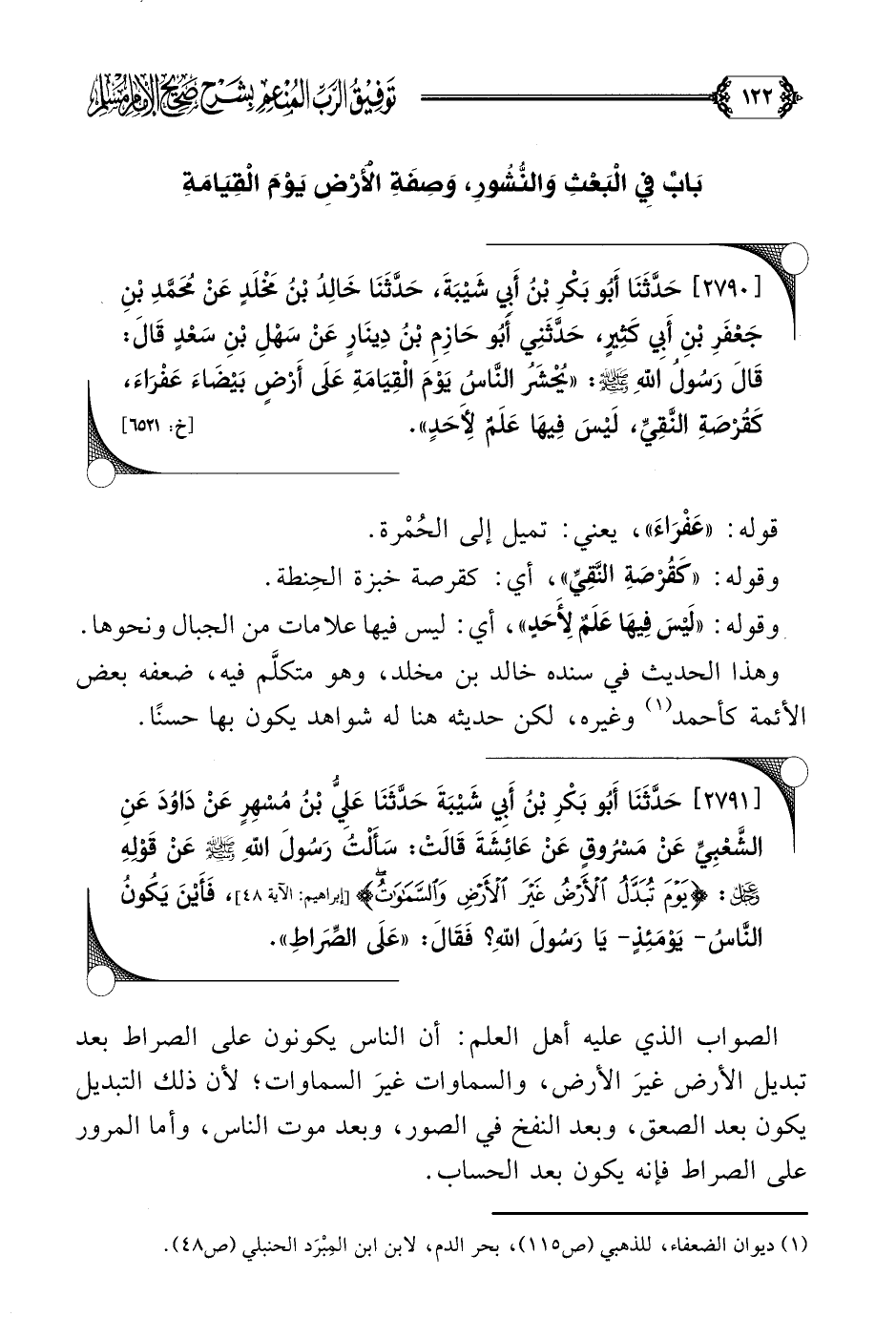 [٢٧٩٠] حَدَّثَنَا أَبُو بَكْرِ بْنُ أَبِي شَيْبَةَ، حَدَّثَنَا خَالِدُ بْنُ مَخْلَدٍ عَنْ مُحَمَّدِ بْنِ جَعْفَرِ بْنِ أَبِي كَثِيرٍ، حَدَّثَنِي أَبُو حَازِمِ بْنُ دِينَارٍ عَنْ سَهْلِ بْنِ سَعْدٍ قَالَ: قَالَ رَسُولُ اللَّهِ صلى الله عليه وسلم: ((يُحْشَرُ النَّاسُ يَوْمَ الْقِيَامَةِ عَلَى أَرْضٍ بَيْضَاءَ عَفْرَاءَ، كَقُرْصَةِ النَّقِيِّ، لَيْسَ فِيهَا عَلَمٌ لِأَحَدٍ)).