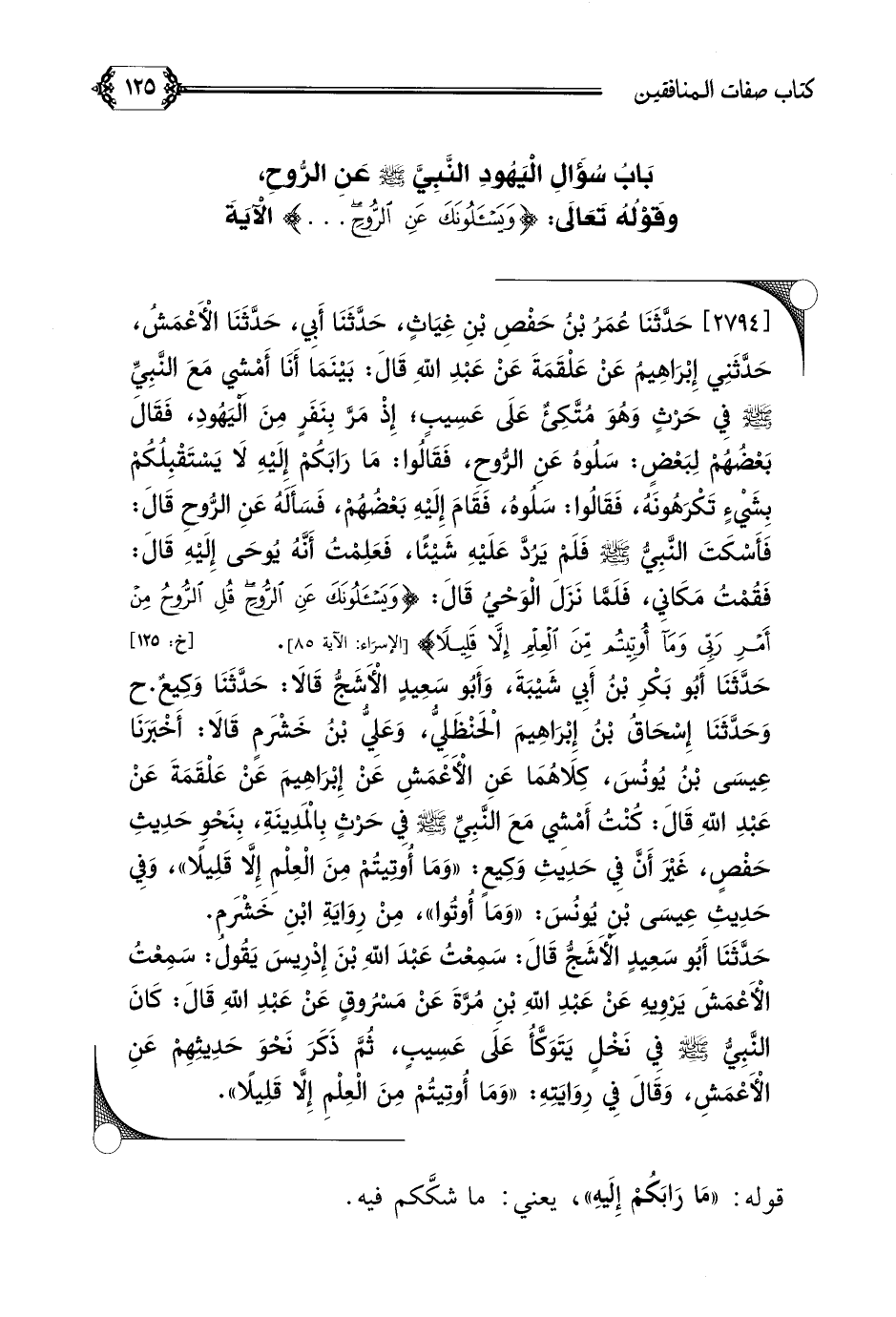 [٢٧٩٤] حَدَّثَنَا عُمَرُ بْنُ حَفْصِ بْنِ غِيَاثٍ، حَدَّثَنَا أَبِي، حَدَّثَنَا الْأَعْمَشُ، حَدَّثَنِي إِبْرَاهِيمُ عَنْ عَلْقَمَةَ عَنْ عَبْدِ اللَّهِ قَالَ: بَيْنَمَا أَنَا أَمْشِي مَعَ النَّبِيِّ صلى الله عليه وسلم فِي حَرْثٍ وَهُوَ مُتَّكِئٌ عَلَى عَسِيبٍ؛ إِذْ مَرَّ بِنَفَرٍ مِنْ الْيَهُودِ، فَقَالَ بَعْضُهُمْ لِبَعْضٍ: سَلُوهُ عَنِ الرُّوحِ، فَقَالُوا: مَا رَابَكُمْ إِلَيْهِ لَا يَسْتَقْبِلُكُمْ بِشَيْءٍ تَكْرَهُونَهُ، فَقَالُوا: سَلُوهُ، فَقَامَ إِلَيْهِ بَعْضُهُمْ، فَسَأَلَهُ عَنِ الرُّوحِ قَالَ: فَأَسْكَتَ النَّبِيُّ صلى الله عليه وسلم فَلَمْ يَرُدَّ عَلَيْهِ شَيْئًا، فَعَلِمْتُ أَنَّهُ يُوحَى إِلَيْهِ قَالَ: فَقُمْتُ مَكَانِي، فَلَمَّا نَزَلَ الْوَحْيُ قَالَ: {وَيَسْأَلُونَكَ عَنِ الرُّوحِ قُلِ الرُّوحُ مِنْ أَمْرِ رَبِّي وَمَا أُوتِيتُمْ مِنَ الْعِلْمِ إِلا قَلِيلا}.