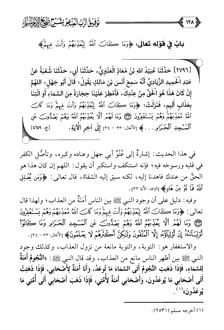[٢٧٩٦] حَدَّثَنَا عُبَيْدُ اللَّهِ بْنُ مُعَاذٍ الْعَنْبَرِيُّ، حَدَّثَنَا أَبِي، حَدَّثَنَا شُعْبَةُ عَنْ عَبْدِ الْحَمِيدِ الزِّيَادِيِّ أَنَّهُ سَمِعَ أَنَسَ بْنَ مَالِكٍ يَقُولُ: قَالَ أَبُو جَهْلٍ: اللَّهُمَّ إِنْ كَانَ هَذَا هُوَ الْحَقَّ مِنْ عِنْدِكَ، فَأَمْطِرْ عَلَيْنَا حِجَارَةً مِنَ السَّمَاءِ أَوِ ائْتِنَا بِعَذَابٍ أَلِيمٍ، فَنَزَلَتْ: {وَمَا كَانَ اللَّهُ لِيُعَذِّبَهُمْ وَأَنْتَ فِيهِمْ وَمَا كَانَ اللَّهُ مُعَذِّبَهُمْ وَهُمْ يَسْتَغْفِرُونَ وَمَا لَهُمْ أَلَّا يُعَذِّبَهُمُ اللَّهُ وَهُمْ يَصُدُّونَ عَنِ الْمَسْجِدِ الْحَرَامِ} إِلَى آخِرِ الْآيَةِ.