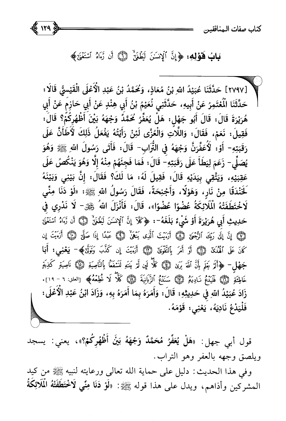 [٢٧٩٧] حَدَّثَنَا عُبَيْدُ اللَّهِ بْنُ مُعَاذٍ، وَمُحَمَّدُ بْنُ عَبْدِ الْأَعْلَى الْقَيْسِيُّ قَالَا: حَدَّثَنَا الْمُعْتَمِرُ عَنْ أَبِيهِ، حَدَّثَنِي نُعَيْمُ بْنُ أَبِي هِنْدٍ عَنْ أَبِي حَازِمٍ عَنْ أَبِي هُرَيْرَةَ قَالَ: قَالَ أَبُو جَهْلٍ: هَلْ يُعَفِّرُ مُحَمَّدٌ وَجْهَهُ بَيْنَ أَظْهُرِكُمْ؟ قَالَ: فَقِيلَ: نَعَمْ، فَقَالَ: وَاللَّاتِ وَالْعُزَّى لَئِنْ رَأَيْتُهُ يَفْعَلُ ذَلِكَ لَأَطَأَنَّ عَلَى رَقَبَتِهِ- أَوْ: لَأُعَفِّرَنَّ وَجْهَهُ فِي التُّرَابِ- قَالَ: فَأَتَى رَسُولَ اللَّهِ صلى الله عليه وسلم وَهُوَ يُصَلِّي- زَعَمَ لِيَطَأَ عَلَى رَقَبَتِهِ- قَالَ: فَمَا فَجِئَهُمْ مِنْهُ إِلَّا وَهُوَ يَنْكُصُ عَلَى عَقِبَيْهِ، وَيَتَّقِي بِيَدَيْهِ قَالَ: فَقِيلَ لَهُ: مَا لَكَ؟ فَقَالَ: إِنَّ بَيْنِي وَبَيْنَهُ لَخَنْدَقًا مِنْ نَارٍ، وَهَوْلًا، وَأَجْنِحَةً، فَقَالَ رَسُولُ اللَّهِ صلى الله عليه وسلم: ((لَوْ دَنَا مِنِّي لَاخْتَطَفَتْهُ الْمَلَائِكَةُ عُضْوًا عُضْوًا))، قَالَ: فَأَنْزَلَ اللَّهُ عز وجل- لَا نَدْرِي فِي حَدِيثِ أَبِي هُرَيْرَةَ أَوْ شَيْءٌ بَلَغَهُ-: {كَلَّا إِنَّ الإِنْسَانَ لَيَطْغَى أَنْ رَأَىهُ اسْتَغْنَى إِنَّ إِلَى رَبِّكَ الرُّجْعَى أَرَأَيْتَ الَّذِي يَنْهَى عَبْدًا إِذَا صَلَّى أَرَأَيْتَ إِنْ كَانَ عَلَى الْهُدَى أَوْ أَمَرَ بِالتَّقْوَى أَرَأَيْتَ إِنْ كَذَّبَ وَتَوَلَّى} - يَعْنِي: أَبَا جَهْلٍ- {أَلَمْ يَعْلَمْ بِأَنَّ اللَّهَ يَرَى كَلَّا لَئِنْ لَمْ يَنْتَهِ لَنَسْفَعًا بِالنَّاصِيَةِ نَاصِيَةٍ كَاذِبَةٍ خَاطِئَةٍ فَلْيَدْعُ نَادِيَهُ سَنَدْعُ الزَّبَانِيَةَ كَلَّا لا تُطِعْهُ}.