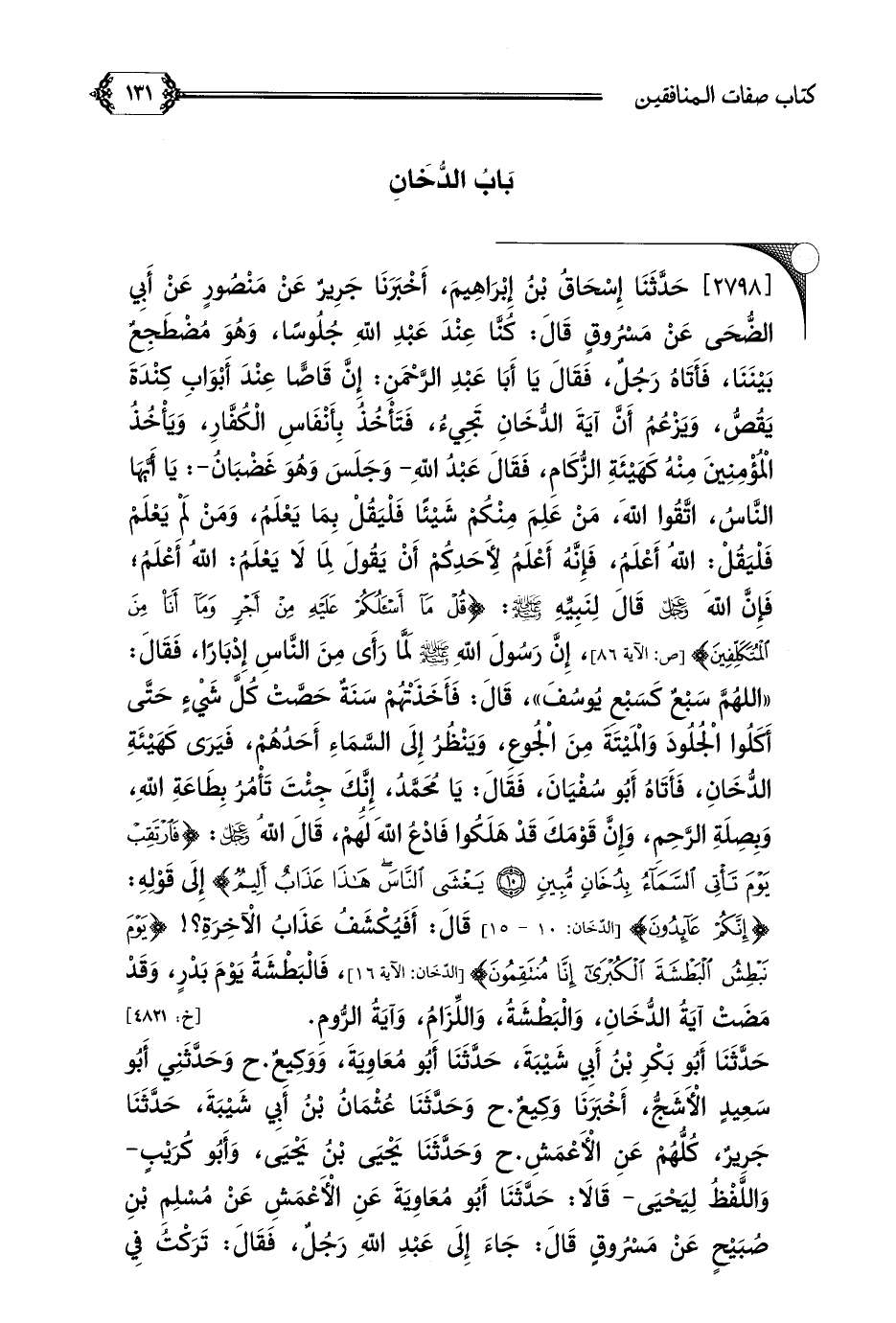 [٢٧٩٨] حَدَّثَنَا إِسْحَاقُ بْنُ إِبْرَاهِيمَ، أَخْبَرَنَا جَرِيرٌ عَنْ مَنْصُورٍ عَنْ أَبِي الضُّحَى عَنْ مَسْرُوقٍ قَالَ: كُنَّا عِنْدَ عَبْدِ اللَّهِ جُلُوسًا، وَهُوَ مُضْطَجِعٌ بَيْنَنَا، فَأَتَاهُ رَجُلٌ، فَقَالَ يَا أَبَا عَبْدِ الرَّحْمَنِ: إِنَّ قَاصًّا عِنْدَ أَبْوَابِ كِنْدَةَ يَقُصُّ، وَيَزْعُمُ أَنَّ آيَةَ الدُّخَانِ تَجِيءُ، فَتَأْخُذُ بِأَنْفَاسِ الْكُفَّارِ، وَيَأْخُذُ الْمُؤْمِنِينَ مِنْهُ كَهَيْئَةِ الزُّكَامِ، فَقَالَ عَبْدُ اللَّهِ- وَجَلَسَ وَهُوَ غَضْبَانُ-: يَا أَيَّهَا النَّاسُ، اتَّقُوا اللَّهَ، مَنْ عَلِمَ مِنْكُمْ شَيْئًا فَلْيَقُلْ بِمَا يَعْلَمُ، وَمَنْ لَمْ يَعْلَمْ فَلْيَقُلْ: اللَّهُ أَعْلَمُ، فَإِنَّهُ أَعْلَمُ لِأَحَدِكُمْ أَنْ يَقُولَ لِمَا لَا يَعْلَمُ: اللَّهُ أَعْلَمُ؛ فَإِنَّ اللَّهَ عز وجل قَالَ لِنَبِيِّهِ صلى الله عليه وسلم: {قُلْ مَا أَسْأَلُكُمْ عَلَيْهِ مِنْ أَجْرٍ وَمَا أَنَا مِنَ الْمُتَكَلِّفِينَ}، إِنَّ رَسُولَ اللَّهِ صلى الله عليه وسلم لَمَّا رَأَى مِنَ النَّاسِ إِدْبَارًا، فَقَالَ: ((اللَّهُمَّ سَبْعٌ كَسَبْعِ يُوسُفَ))، قَالَ: فَأَخَذَتْهُمْ سَنَةٌ حَصَّتْ كُلَّ شَيْءٍ حَتَّى أَكَلُوا الْجُلُودَ وَالْمَيْتَةَ مِنَ الْجُوعِ، وَيَنْظُرُ إِلَى السَّمَاءِ أَحَدُهُمْ، فَيَرَى كَهَيْئَةِ الدُّخَانِ، فَأَتَاهُ أَبُو سُفْيَانَ، فَقَالَ: يَا مُحَمَّدُ، إِنَّكَ جِئْتَ تَأْمُرُ بِطَاعَةِ اللَّهِ، وَبِصِلَةِ الرَّحِمِ، وَإِنَّ قَوْمَكَ قَدْ هَلَكُوا فَادْعُ اللَّهَ لَهُمْ، قَالَ اللَّهُ عز وجل: {فَارْتَقِبْ يَوْمَ تَأْتِي السَّمَاءُ بِدُخَانٍ مُبِينٍ يَغْشَى النَّاسَ هَذَا عَذَابٌ أَلِيمٌ} إِلَى قَوْلِهِ: {إِنَّكُمْ عَائِدُونَ} قَالَ: أَفَيُكْشَفُ عَذَابُ الْآخِرَةِ؟ ! {يَوْمَ نَبْطِشُ الْبَطْشَةَ الْكُبْرَى إِنَّا