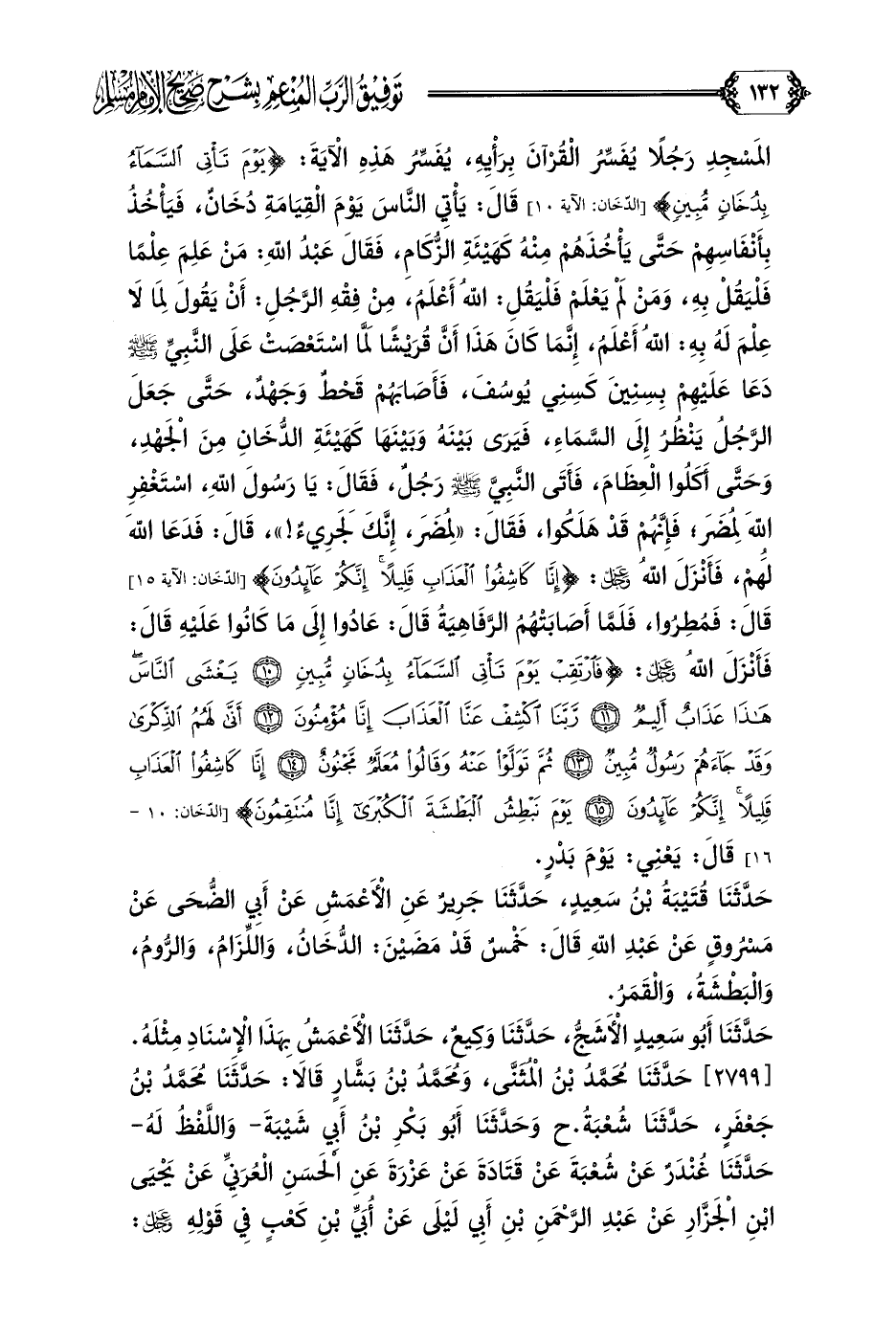 الْمَسْجِدِ رَجُلًا يُفَسِّرُ الْقُرْآنَ بِرَأْيِهِ، يُفَسِّرُ هَذِهِ الْآيَةَ: {يَوْمَ تَأْتِي السَّمَاءُ بِدُخَانٍ مُبِينٍ} قَالَ: يَأْتِي النَّاسَ يَوْمَ الْقِيَامَةِ دُخَانٌ، فَيَأْخُذُ بِأَنْفَاسِهِمْ حَتَّى يَأْخُذَهُمْ مِنْهُ كَهَيْئَةِ الزُّكَامِ، فَقَالَ عَبْدُ اللَّهِ: مَنْ عَلِمَ عِلْمًا فَلْيَقُلْ بِهِ، وَمَنْ لَمْ يَعْلَمْ فَلْيَقُلِ: اللَّهُ أَعْلَمُ، مِنْ فِقْهِ الرَّجُلِ: أَنْ يَقُولَ لِمَا لَا عِلْمَ لَهُ بِهِ: اللَّهُ أَعْلَمُ، إِنَّمَا كَانَ هَذَا أَنَّ قُرَيْشًا لَمَّا اسْتَعْصَتْ عَلَى النَّبِيِّ صلى الله عليه وسلم دَعَا عَلَيْهِمْ بِسِنِينَ كَسِنِي يُوسُفَ، فَأَصَابَهُمْ قَحْطٌ وَجَهْدٌ، حَتَّى جَعَلَ الرَّجُلُ يَنْظُرُ إِلَى السَّمَاءِ، فَيَرَى بَيْنَهُ وَبَيْنَهَا كَهَيْئَةِ الدُّخَانِ مِنَ الْجَهْدِ، وَحَتَّى أَكَلُوا الْعِظَامَ، فَأَتَى النَّبِيَّ صلى الله عليه وسلم رَجُلٌ، فَقَالَ: يَا رَسُولَ اللَّهِ، اسْتَغْفِرِ اللَّهَ لِمُضَرَ؛ فَإِنَّهُمْ قَدْ هَلَكُوا، فَقَالَ: ((لِمُضَرَ، إِنَّكَ لَجَرِيءٌ! ))، قَالَ: فَدَعَا اللَّهَ لَهُمْ، فَأَنْزَلَ اللَّهُ عز وجل: {إِنَّا كَاشِفُو الْعَذَابِ قَلِيلا إِنَّكُمْ عَائِدُونَ} قَالَ: فَمُطِرُوا، فَلَمَّا أَصَابَتْهُمُ الرَّفَاهِيَةُ قَالَ: عَادُوا إِلَى مَا كَانُوا عَلَيْهِ قَالَ: فَأَنْزَلَ اللَّهُ عز وجل: {فَارْتَقِبْ يَوْمَ تَأْتِي السَّمَاءُ بِدُخَانٍ مُبِينٍ يَغْشَى النَّاسَ هَذَا عَذَابٌ أَلِيمٌ يَوْمَ نَبْطِشُ الْبَطْشَةَ الْكُبْرَى إِنَّا مُنْتَقِمُونَ} قَالَ: