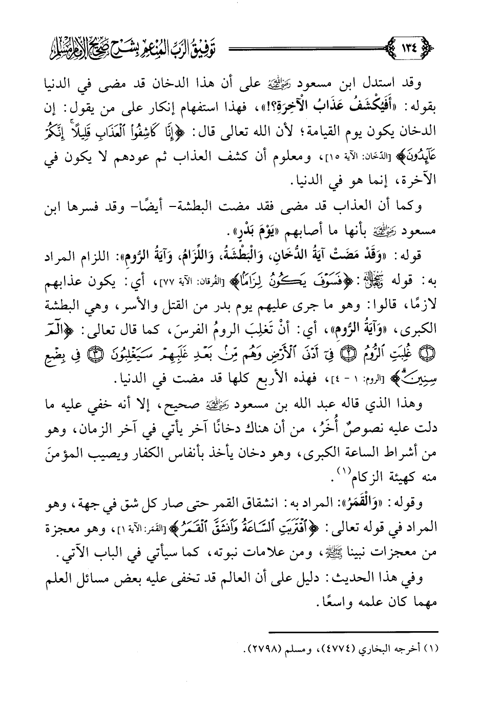 وهذا الذي قاله عبد الله بن مسعود رضي الله عنه صحيح، إلا أنه خفي عليه ما دلت عليه نصوصٌ أُخَرُ، من أن هناك دخانًا آخر يأتي في آخر الزمان، وهو من أشراط الساعة الكبرى، وهو دخان يأخذ بأنفاس الكفار ويصيب المؤمنَ منه كهيئة الزكام (¬١).