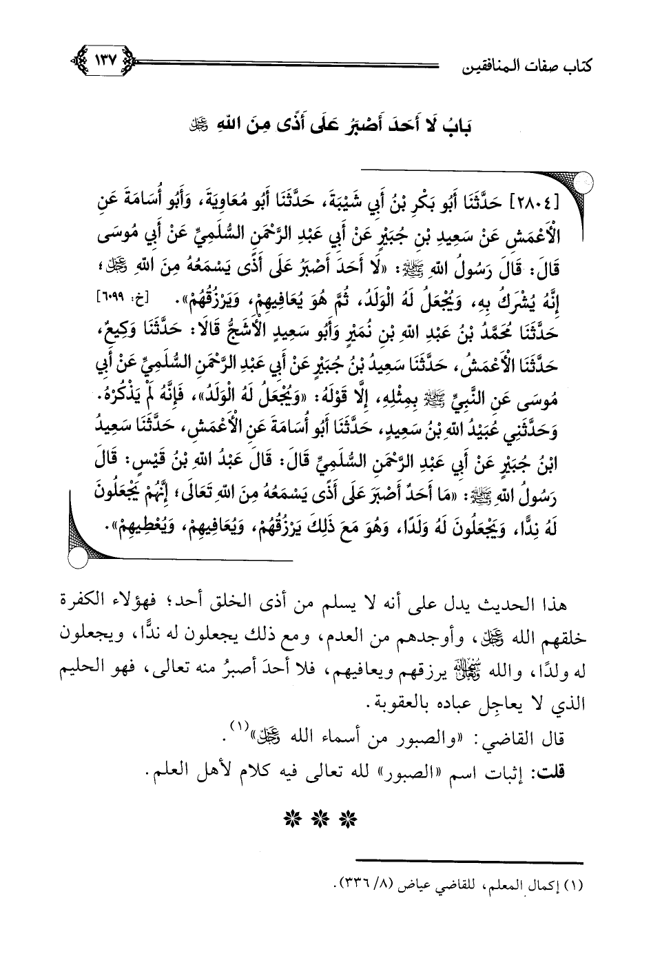 وَحَدَّثَنِي عُبَيْدُ اللَّهِ بْنُ سَعِيدٍ، حَدَّثَنَا أَبُو أُسَامَةَ عَنِ الْأَعْمَشِ، حَدَّثَنَا سَعِيدُ بْنُ جُبَيْرٍ عَنْ أَبِي عَبْدِ الرَّحْمَنِ السُّلَمِيِّ قَالَ: قَالَ عَبْدُ اللَّهِ بْنُ قَيْسٍ: قَالَ رَسُولُ اللَّهِ صلى الله عليه وسلم: ((مَا أَحَدٌ أَصْبَرَ عَلَى أَذًى يَسْمَعُهُ مِنَ اللَّهِ تَعَالَى؛ إِنَّهُمْ يَجْعَلُونَ لَهُ نِدًّا، وَيَجْعَلُونَ لَهُ وَلَدًا، وَهُوَ مَعَ ذَلِكَ يَرْزُقُهُمْ، وَيُعَافِيهِمْ، وَيُعْطِيهِمْ)).