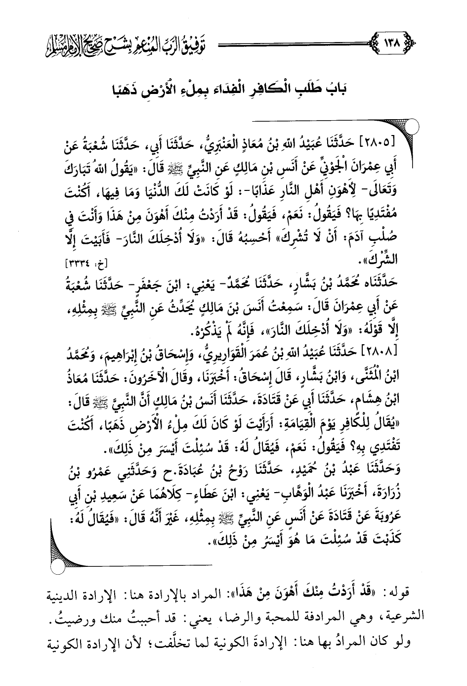 [٢٨٠٥] حَدَّثَنَا عُبَيْدُ اللَّهِ بْنُ مُعَاذٍ الْعَنْبَرِيُّ، حَدَّثَنَا أَبِي، حَدَّثَنَا شُعْبَةُ عَنْ أَبِي عِمْرَانَ الْجَوْنِيِّ عَنْ أَنَسِ بْنِ مَالِكٍ عَنِ النَّبِيِّ صلى الله عليه وسلم قَالَ: ((يَقُولُ اللَّهُ تَبَارَكَ وَتَعَالَى- لِأَهْوَنِ أَهْلِ النَّارِ عَذَابًا-: لَوْ كَانَتْ لَكَ الدُّنْيَا وَمَا فِيهَا، أَكُنْتَ مُفْتَدِيًا بِهَا؟ فَيَقُولُ: نَعَمْ، فَيَقُولُ: قَدْ أَرَدْتُ مِنْكَ أَهْوَنَ مِنْ هَذَا وَأَنْتَ فِي صُلْبِ آدَمَ: أَنْ لَا تُشْرِكَ)) أَحْسِبُهُ قَالَ: ((وَلَا أُدْخِلَكَ النَّارَ- فَأَبَيْتَ إِلَّا الشِّرْكَ)).