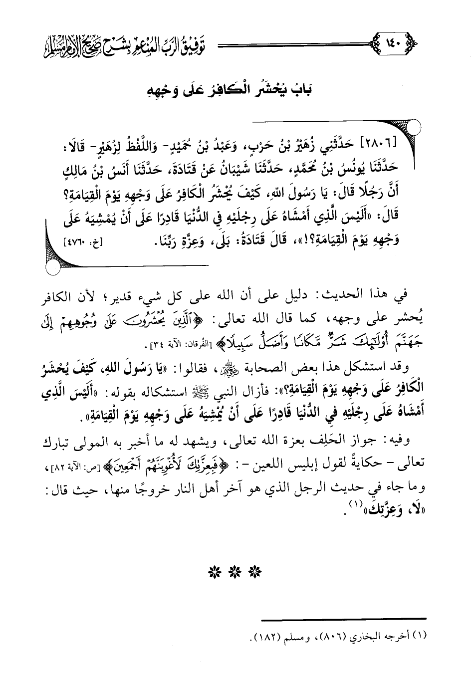 [٢٨٠٦] حَدَّثَنِي زُهَيْرُ بْنُ حَرْبٍ، وَعَبْدُ بْنُ حُمَيْدٍ- وَاللَّفْظُ لِزُهَيْرٍ- قَالَا: حَدَّثَنَا يُونُسُ بْنُ مُحَمَّدٍ، حَدَّثَنَا شَيْبَانُ عَنْ قَتَادَةَ، حَدَّثَنَا أَنَسُ بْنُ مَالِكٍ أَنَّ رَجُلًا قَالَ: يَا رَسُولَ اللَّهِ، كَيْفَ يُحْشَرُ الْكَافِرُ عَلَى وَجْهِهِ يَوْمَ الْقِيَامَةِ؟ قَالَ: ((أَلَيْسَ الَّذِي أَمْشَاهُ عَلَى رِجْلَيْهِ فِي الدُّنْيَا قَادِرًا عَلَى أَنْ يُمْشِيَهُ عَلَى وَجْهِهِ يَوْمَ الْقِيَامَةِ؟ ! ))، قَالَ قَتَادَةُ: بَلَى، وَعِزَّةِ رَبِّنَا.