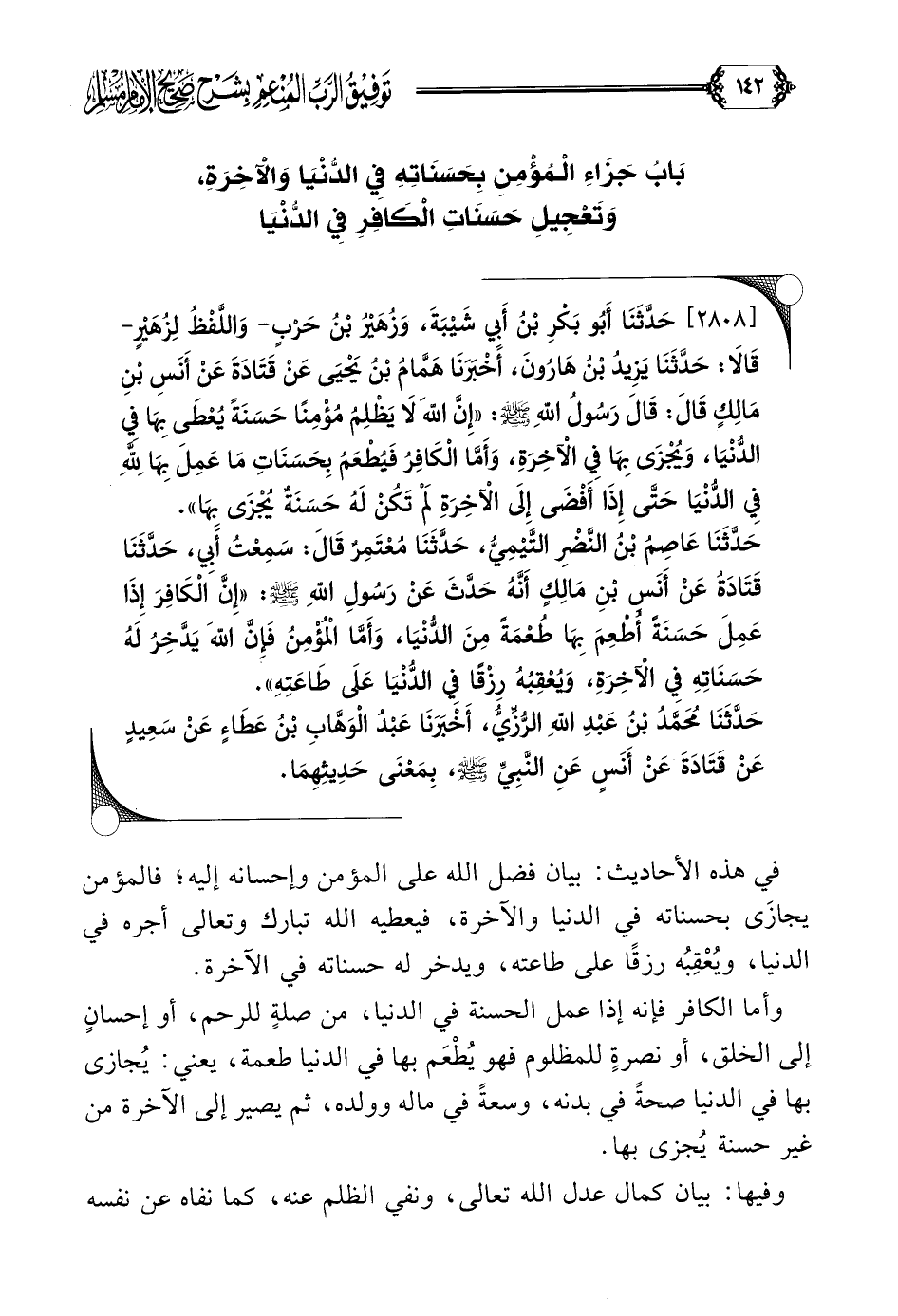[٢٨٠٨] حَدَّثَنَا أَبُو بَكْرِ بْنُ أَبِي شَيْبَةَ، وَزُهَيْرُ بْنُ حَرْبٍ- وَاللَّفْظُ لِزُهَيْرٍ- قَالَا: حَدَّثَنَا يَزِيدُ بْنُ هَارُونَ، أَخْبَرَنَا هَمَّامُ بْنُ يَحْيَى عَنْ قَتَادَةَ عَنْ أَنَسِ بْنِ مَالِكٍ قَالَ: قَالَ رَسُولُ اللَّهِ صلى الله عليه وسلم: ((إِنَّ اللَّهَ لَا يَظْلِمُ مُؤْمِنًا حَسَنَةً يُعْطَى بِهَا فِي الدُّنْيَا، وَيُجْزَى بِهَا فِي الْآخِرَةِ، وَأَمَّا الْكَافِرُ فَيُطْعَمُ بِحَسَنَاتِ مَا عَمِلَ بِهَا لِلَّهِ فِي الدُّنْيَا حَتَّى إِذَا أَفْضَى إِلَى الْآخِرَةِ لَمْ تَكُنْ لَهُ حَسَنَةٌ يُجْزَى بِهَا)).