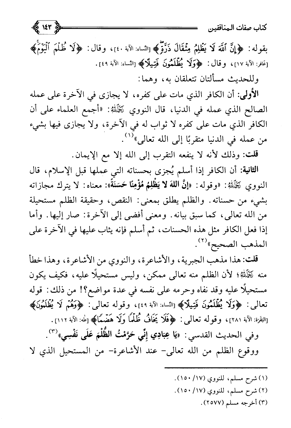 قلت: هذا مذهب الجبرية، والأشاعرة، والنووي من الأشاعرة، وهذا خطأ منه رحمه الله؛ لأن الظلم منه تعالى ممكن، وليس مستحيلًا عليه، فكيف يكون مستحيلًا عليه وقد نفاه وحرمه على نفسه في عدة مواضع؟ ! من ذلك: قوله تعالى: {ولا يُظْلَمُونَ فَتِيلًا}، وقوله تعالى: {وَهُمْ لا يُظْلَمُونَ}، وقوله تعالى: {فَلا يَخَافُ ظُلْمًا وَلا هَضْمًا}.