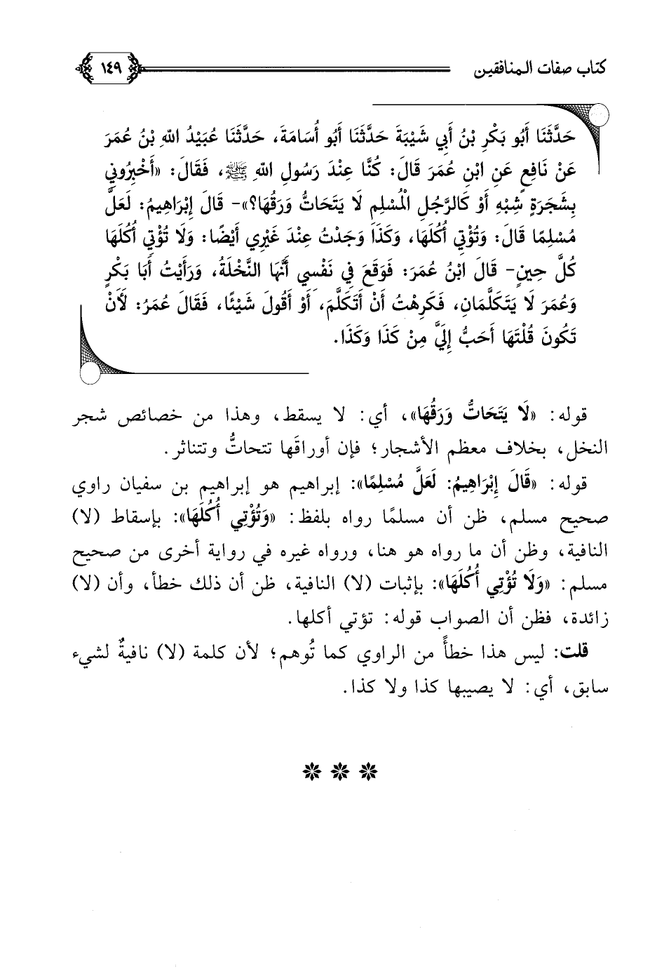 قوله: ((قَالَ إِبْرَاهِيمُ: لَعَلَّ مُسْلِمًا)): إبراهيم هو إبراهيم بن سفيان راوي صحيح مسلم، ظن أن مسلمًا رواه بلفظ: ((وَتُؤْتِي أُكُلَهَا)): بإسقاط (لا) النافية، وظن أن ما رواه هو هنا، ورواه غيره في رواية أخرى من صحيح مسلم: ((وَلَا تُؤْتِي أُكُلَهَا)): بإثبات (لا) النافية، ظن أن ذلك خطأ، وأن (لا) زائدة، فظن أن الصواب قوله: تؤتي أكلها.
