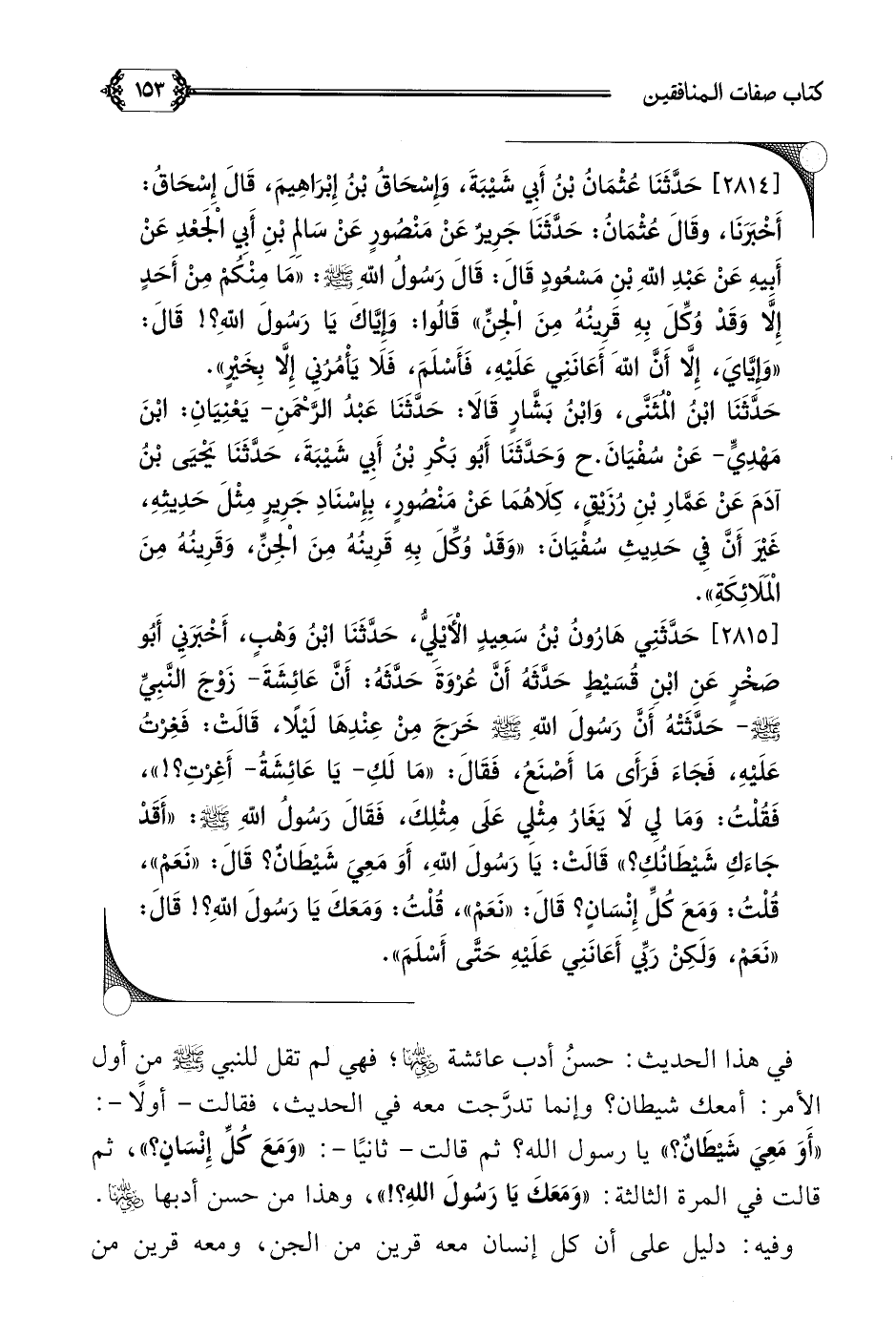 [٢٨١٥] حَدَّثَنِي هَارُونُ بْنُ سَعِيدٍ الْأَيْلِيُّ، حَدَّثَنَا ابْنُ وَهْبٍ، أَخْبَرَنِي أَبُو صَخْرٍ عَنِ ابْنِ قُسَيْطٍ حَدَّثَهُ أَنَّ عُرْوَةَ حَدَّثَهُ: أَنَّ عَائِشَةَ- زَوْجَ النَّبِيِّ صلى الله عليه وسلم- حَدَّثَتْهُ أَنَّ رَسُولَ اللَّهِ صلى الله عليه وسلم خَرَجَ مِنْ عِنْدِهَا لَيْلًا، قَالَتْ: فَغِرْتُ عَلَيْهِ، فَجَاءَ فَرَأَى مَا أَصْنَعُ، فَقَالَ: ((مَا لَكِ- يَا عَائِشَةُ- أَغِرْتِ؟ ! ))، فَقُلْتُ: وَمَا لِي لَا يَغَارُ مِثْلِي عَلَى مِثْلِكَ، فَقَالَ رَسُولُ اللَّهِ صلى الله عليه وسلم: ((أَقَدْ جَاءَكِ شَيْطَانُكِ؟ )) قَالَتْ: يَا رَسُولَ اللَّهِ، أَوَ مَعِيَ شَيْطَانٌ؟ قَالَ: ((نَعَمْ))، قُلْتُ: وَمَعَ كُلِّ إِنْسَانٍ؟ قَالَ: ((نَعَمْ))، قُلْتُ: وَمَعَكَ يَا رَسُولَ اللَّهِ؟ ! قَالَ: ((نَعَمْ، وَلَكِنْ رَبِّي أَعَانَنِي عَلَيْهِ حَتَّى أَسْلَمَ)).