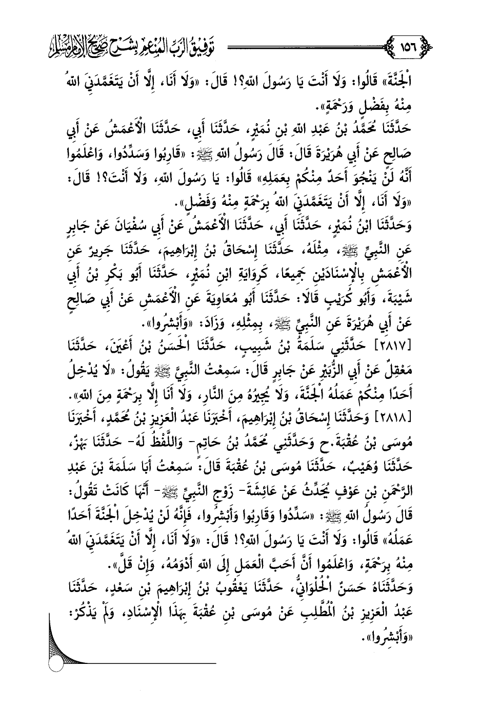 [٢٨١٧] حَدَّثَنِي سَلَمَةُ بْنُ شَبِيبٍ، حَدَّثَنَا الْحَسَنُ بْنُ أَعْيَنَ، حَدَّثَنَا مَعْقِلٌ عَنْ أَبِي الزُّبَيْرِ عَنْ جَابِرٍ قَالَ: سَمِعْتُ النَّبِيَّ صلى الله عليه وسلم يَقُولُ: ((لَا يُدْخِلُ أَحَدًا مِنْكُمْ عَمَلُهُ الْجَنَّةَ، وَلَا يُجِيرُهُ مِنَ النَّارِ، وَلَا أَنَا إِلَّا بِرَحْمَةٍ مِنَ اللَّهِ)).