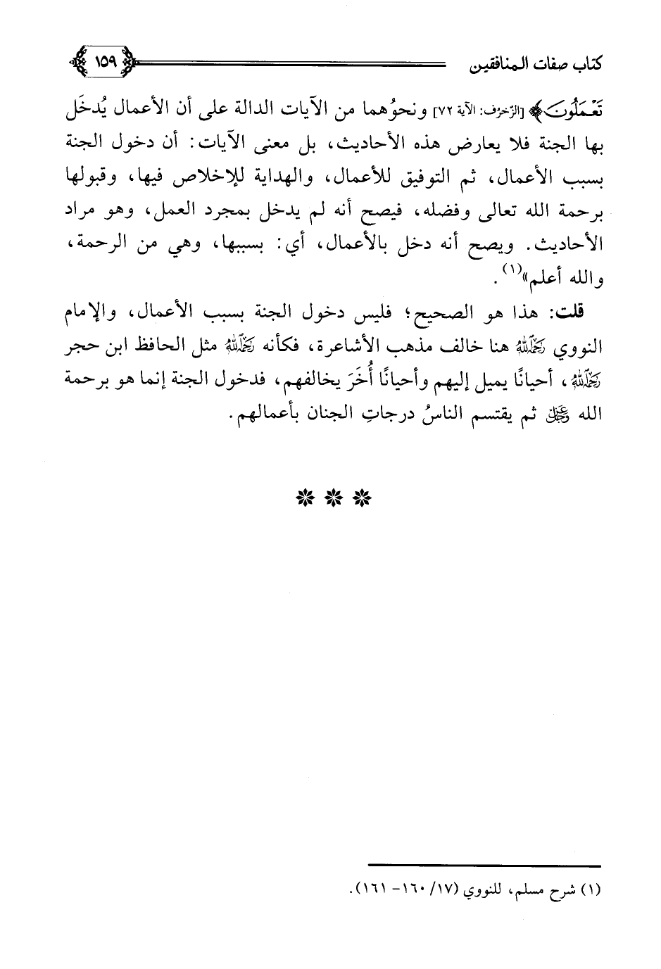 قلت: هذا هو الصحيح؛ فليس دخول الجنة بسبب الأعمال، والإمام النووي رحمه الله هنا خالف مذهب الأشاعرة، فكأنه رحمه الله مثل الحافظ ابن حجر رحمه الله، أحيانًا يميل إليهم وأحيانًا أُخَرَ يخالفهم، فدخول الجنة إنما هو برحمة الله عز وجل، ثم يقتسم الناسُ درجاتِ الجنان بأعمالهم.