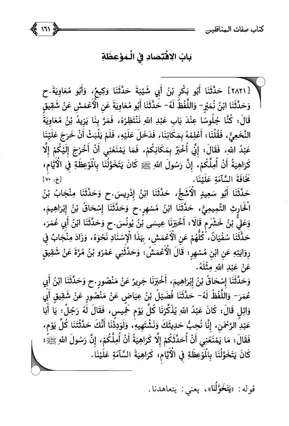 [٢٨٢١] حَدَّثَنَا أَبُو بَكْرِ بْنُ أَبِي شَيْبَةَ حَدَّثَنَا وَكِيعٌ، وَأَبُو مُعَاوِيَةَ. ح وَحَدَّثَنَا ابْنُ نُمَيْرٍ- وَاللَّفْظُ لَهُ- حَدَّثَنَا أَبُو مُعَاوِيَةَ عَنِ الْأَعْمَشِ عَنْ شَقِيقٍ قَالَ: كُنَّا جُلُوسًا عِنْدَ بَابِ عَبْدِ اللَّهِ نَنْتَظِرُهُ، فَمَرَّ بِنَا يَزِيدُ بْنُ مُعَاوِيَةَ النَّخَعِيُّ، فَقُلْنَا: أَعْلِمْهُ بِمَكَانِنَا، فَدَخَلَ عَلَيْهِ، فَلَمْ يَلْبَثْ أَنْ خَرَجَ عَلَيْنَا عَبْدُ اللَّهِ، فَقَالَ: إِنِّي أُخْبَرُ بِمَكَانِكُمْ، فَمَا يَمْنَعُنِي أَنْ أَخْرُجَ إِلَيْكُمْ إِلَّا كَرَاهِيَةُ أَنْ أُمِلَّكُمْ، إِنَّ رَسُولَ اللَّهِ صلى الله عليه وسلم كَانَ يَتَخَوَّلُنَا بِالْمَوْعِظَةِ فِي الْأَيَّامِ؛ مَخَافَةَ السَّآمَةِ عَلَيْنَا.