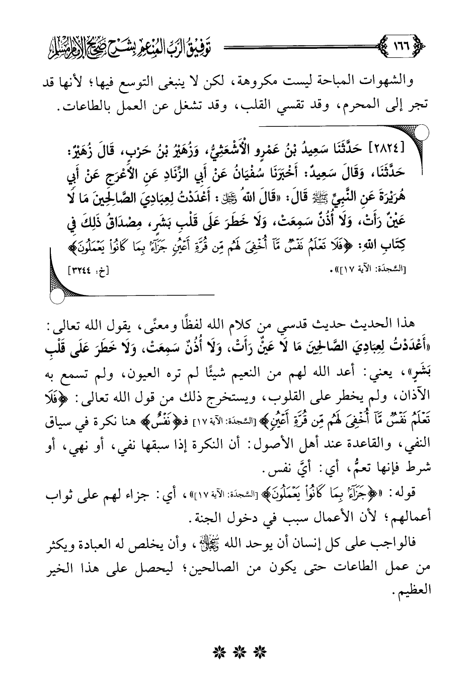 هذا الحديث حديث قدسي من كلام الله لفظًا ومعنًى، يقول الله تعالى: ((أَعْدَدْتُ لِعِبَادِيَ الصَّالِحِينَ مَا لَا عَيْنٌ رَأَتْ، وَلَا أُذُنٌ سَمِعَتْ، وَلَا خَطَرَ عَلَى قَلْبِ بَشَرٍ))، يعني: أعد الله لهم من النعيم شيئًا لم تره العيون، ولم تسمع به الآذان، ولم يخطر على القلوب، ويستخرج ذلك من قول الله تعالى: {فَلا تَعْلَمُ نَفْسٌ مَا أُخْفِيَ لَهُمْ مِنْ قُرَّةِ أَعْيُنٍ} فـ {نفس} هنا نكرة في سياق النفي، والقاعدة عند أهل الأصول: أن النكرة إذا سبقها نفي، أو نهي، أو شرط فإنها تعمُّ، أي: أيَّ نفس.