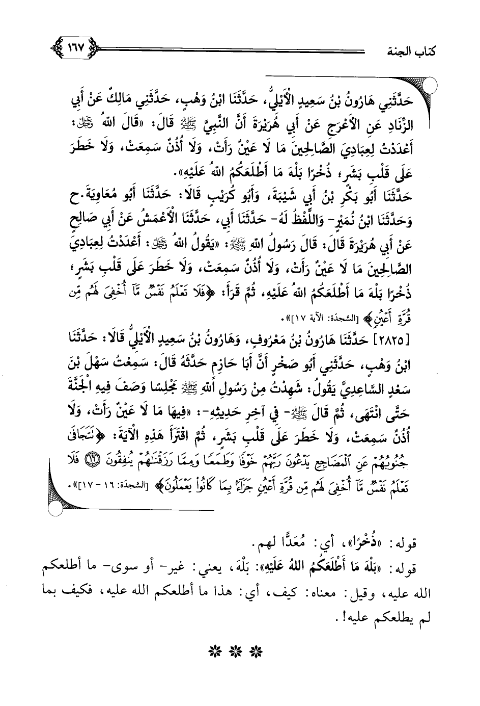 [٢٨٢٥] حَدَّثَنَا هَارُونُ بْنُ مَعْرُوفٍ، وَهَارُونُ بْنُ سَعِيدٍ الْأَيْلِيُّ قَالَا: حَدَّثَنَا ابْنُ وَهْبٍ، حَدَّثَنِي أَبُو صَخْرٍ أَنَّ أَبَا حَازِمٍ حَدَّثَهُ قَالَ: سَمِعْتُ سَهْلَ بْنَ سَعْدٍ السَّاعِدِيَّ يَقُولُ: شَهِدْتُ مِنْ رَسُولِ اللَّهِ صلى الله عليه وسلم مَجْلِسًا وَصَفَ فِيهِ الْجَنَّةَ حَتَّى انْتَهَى، ثُمَّ قَالَ صلى الله عليه وسلم- فِي آخِرِ حَدِيثِهِ-: ((فِيهَا مَا لَا عَيْنٌ رَأَتْ، وَلَا أُذُنٌ سَمِعَتْ، وَلَا خَطَرَ عَلَى قَلْبِ بَشَرٍ، ثُمَّ اقْتَرَأَ هَذِهِ الْآيَةَ: {تَتَجَافَى جُنُوبُهُمْ عَنِ المَضَاجِعِ يَدْعُونَ رَبَّهُمْ خَوْفًا وَطَمَعًا وَمِمَّا رَزَقْنَاهُمْ يُنْفِقُونَ فَلا تَعْلَمُ نَفْسٌ مَا أُخْفِيَ لَهُمْ مِنْ قُرَّةِ أَعْيُنٍ جَزَاءً بِمَا كَانُوا يَعْمَلُونَ})).