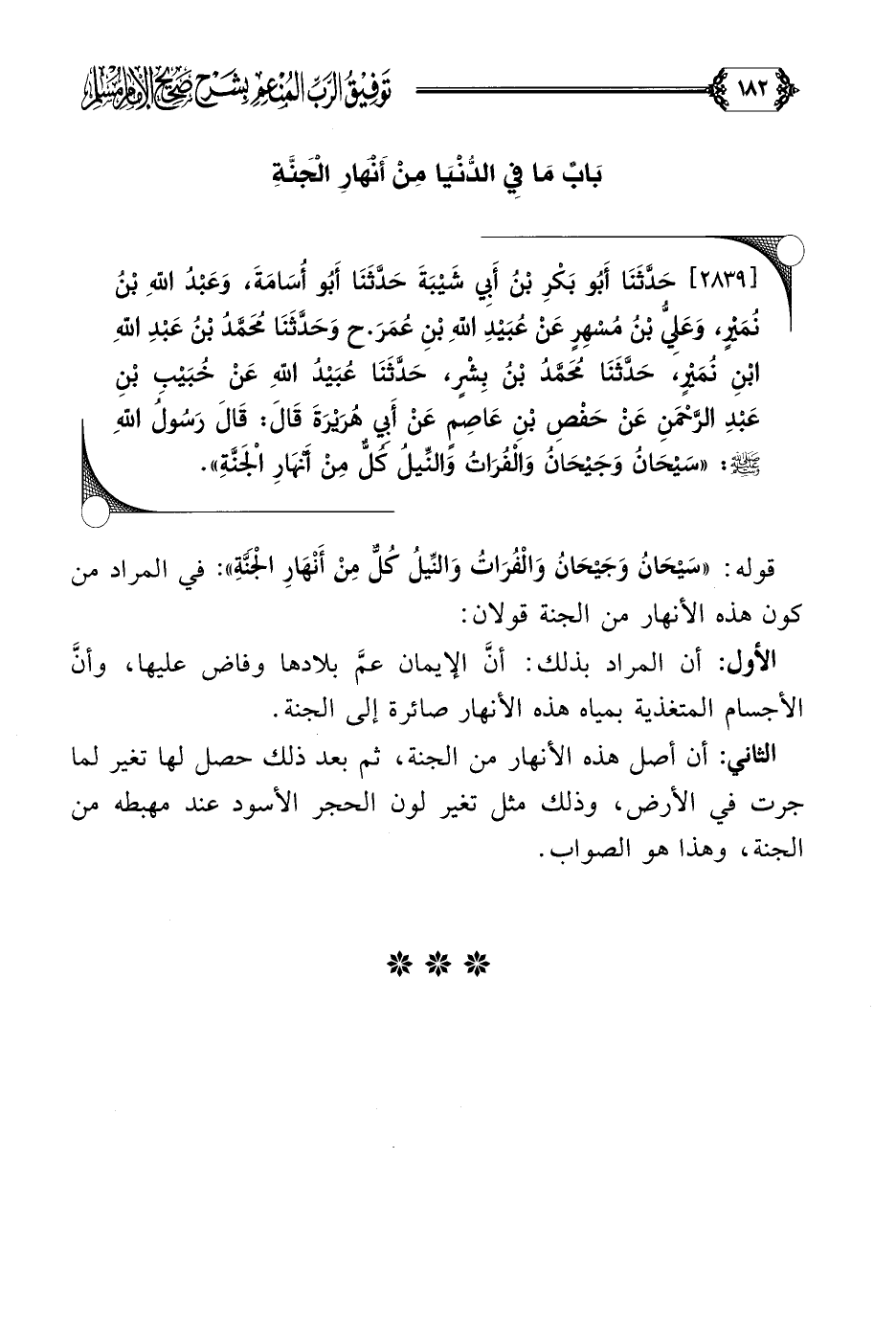 [٢٨٣٩] حَدَّثَنَا أَبُو بَكْرِ بْنُ أَبِي شَيْبَةَ حَدَّثَنَا أَبُو أُسَامَةَ، وَعَبْدُ اللَّهِ بْنُ نُمَيْرٍ، وَعَلِيُّ بْنُ مُسْهِرٍ عَنْ عُبَيْدِ اللَّهِ بْنِ عُمَرَ. ح وَحَدَّثَنَا مُحَمَّدُ بْنُ عَبْدِ اللَّهِ بْنِ نُمَيْرٍ، حَدَّثَنَا مُحَمَّدُ بْنُ بِشْرٍ، حَدَّثَنَا عُبَيْدُ اللَّهِ عَنْ خُبَيْبِ بْنِ عَبْدِ الرَّحْمَنِ عَنْ حَفْصِ بْنِ عَاصِمٍ عَنْ أَبِي هُرَيْرَةَ قَالَ: قَالَ رَسُولُ اللَّهِ صلى الله عليه وسلم: ((سَيْحَانُ وَجَيْحَانُ وَالْفُرَاتُ وَالنِّيلُ كُلٌّ مِنْ أَنْهَارِ الْجَنَّةِ)).