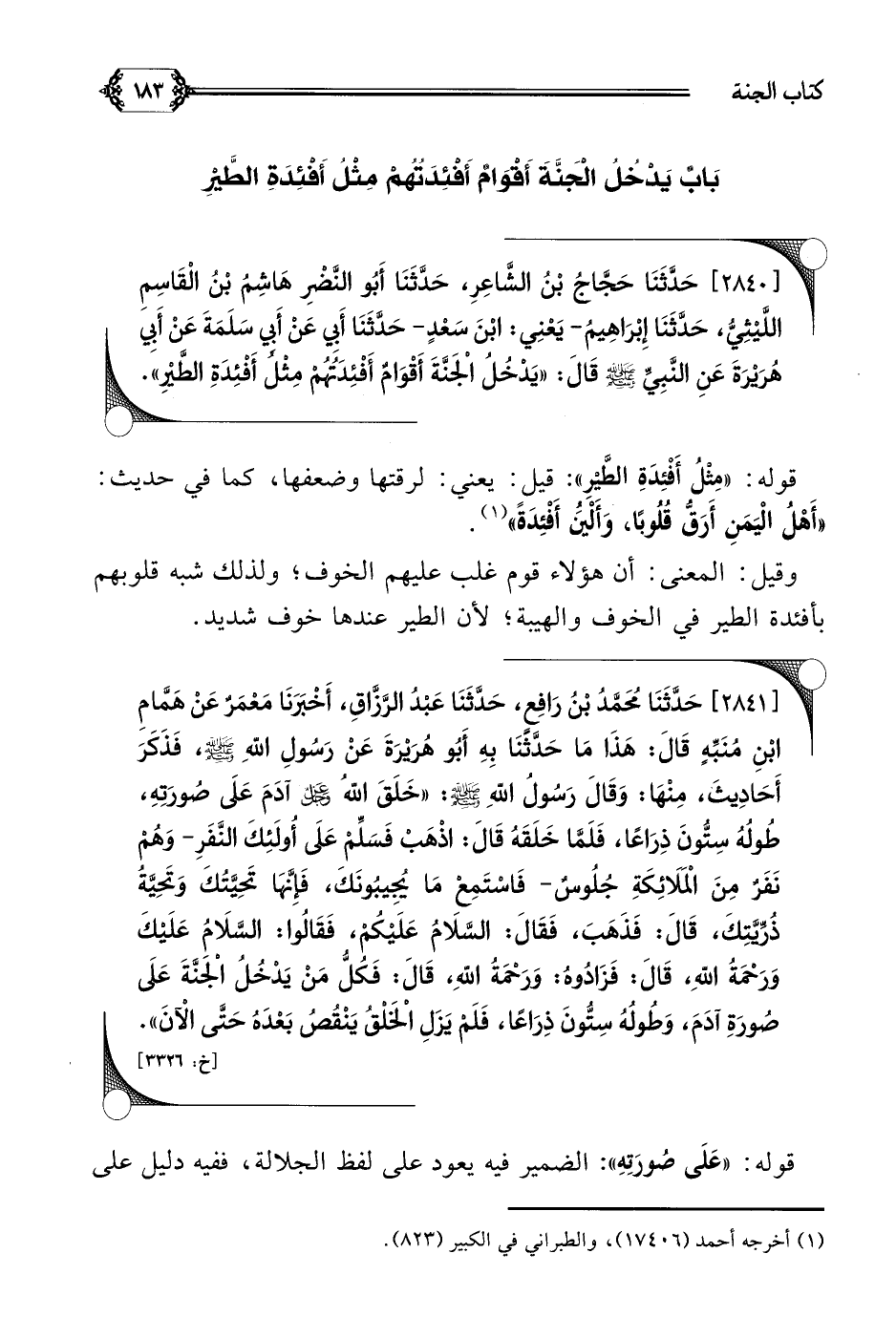 [٢٨٤٠] حَدَّثَنَا حَجَّاجُ بْنُ الشَّاعِرِ، حَدَّثَنَا أَبُو النَّضْرِ هَاشِمُ بْنُ الْقَاسِمِ اللَّيْثِيُّ، حَدَّثَنَا إِبْرَاهِيمُ- يَعْنِي: ابْنَ سَعْدٍ- حَدَّثَنَا أَبِي عَنْ أَبِي سَلَمَةَ عَنْ أَبِي هُرَيْرَةَ عَنِ النَّبِيِّ صلى الله عليه وسلم قَالَ: ((يَدْخُلُ الْجَنَّةَ أَقْوَامٌ أَفْئِدَتُهُمْ مِثْلُ أَفْئِدَةِ الطَّيْرِ)).