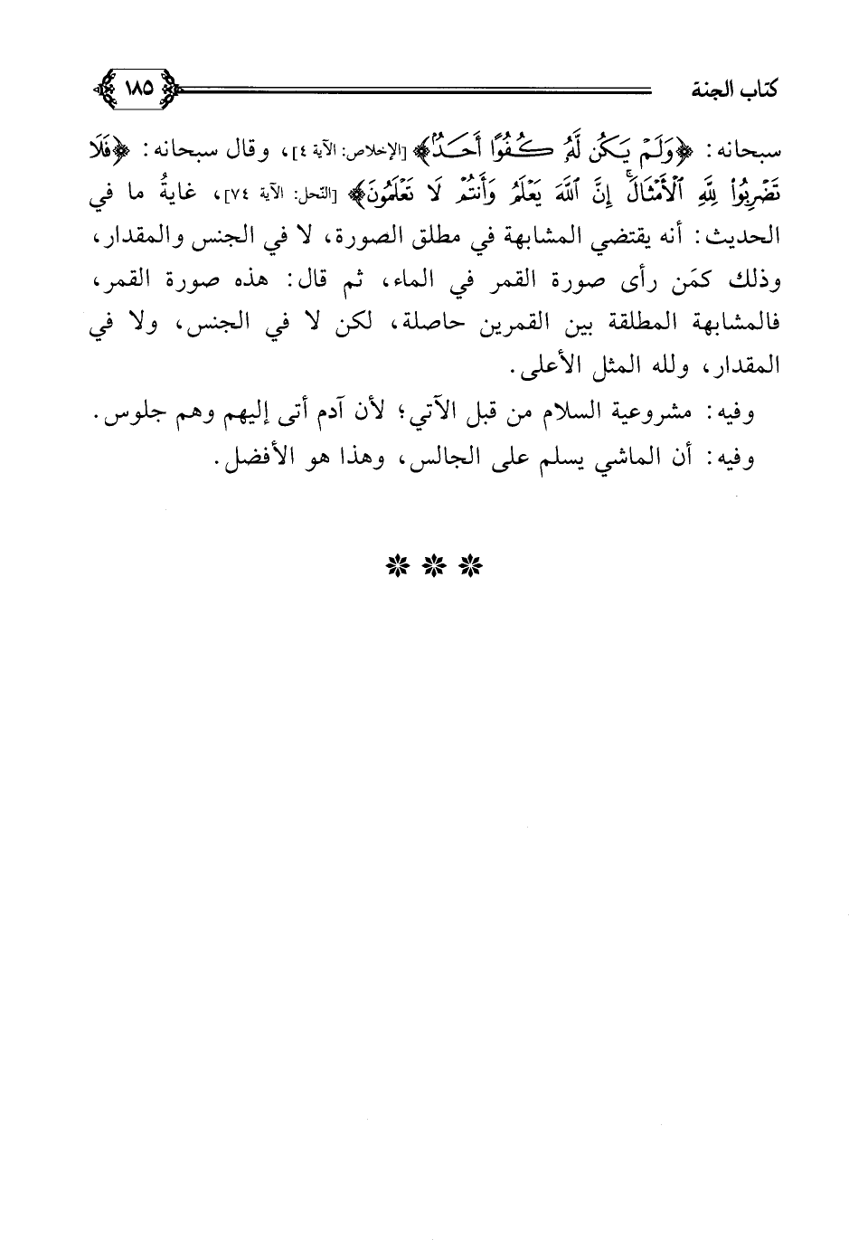 سبحانه: {ولَمْ يَكُنْ لَهُ كُفُوًا أَحَدٌ}، وقال سبحانه: {فَلَا تَضْرِبُوا لِلَّهِ الْأَمْثَالَ إِنَّ اللَّهَ يَعْلَمُ وَأَنتُمْ لَا تَعْلَمُونَ}، غايةُ ما في الحديث: أنه يقتضي المشابهة في مطلق الصورة، لا في الجنس والمقدار، وذلك كمَن رأى صورة القمر في الماء، ثم قال: هذه صورة القمر، فالمشابهة المطلقة بين القمرين حاصلة، لكن لا في الجنس، ولا في المقدار، ولله المثل الأعلى.