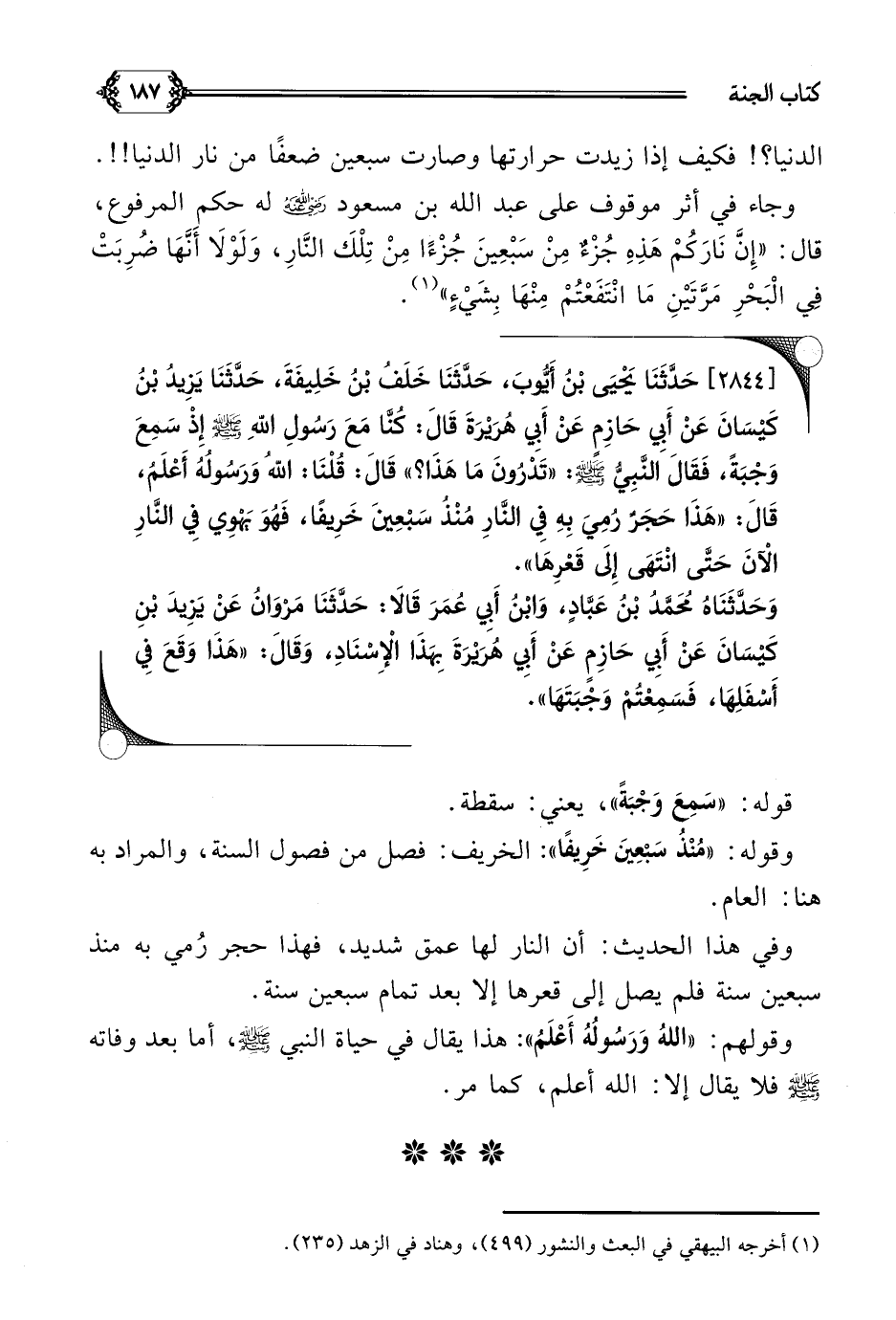 [٢٨٤٤] حَدَّثَنَا يَحْيَى بْنُ أَيُّوبَ، حَدَّثَنَا خَلَفُ بْنُ خَلِيفَةَ، حَدَّثَنَا يَزِيدُ بْنُ كَيْسَانَ عَنْ أَبِي حَازِمٍ عَنْ أَبِي هُرَيْرَةَ قَالَ: كُنَّا مَعَ رَسُولِ اللَّهِ صلى الله عليه وسلم إِذْ سَمِعَ وَجْبَةً، فَقَالَ النَّبِيُّ صلى الله عليه وسلم: ((تَدْرُونَ مَا هَذَا؟ )) قَالَ: قُلْنَا: اللَّهُ وَرَسُولُهُ أَعْلَمُ، قَالَ: ((هَذَا حَجَرٌ رُمِيَ بِهِ فِي النَّارِ مُنْذُ سَبْعِينَ خَرِيفًا، فَهُوَ يَهْوِي فِي النَّارِ الْآنَ حَتَّى انْتَهَى إِلَى قَعْرِهَا)).
